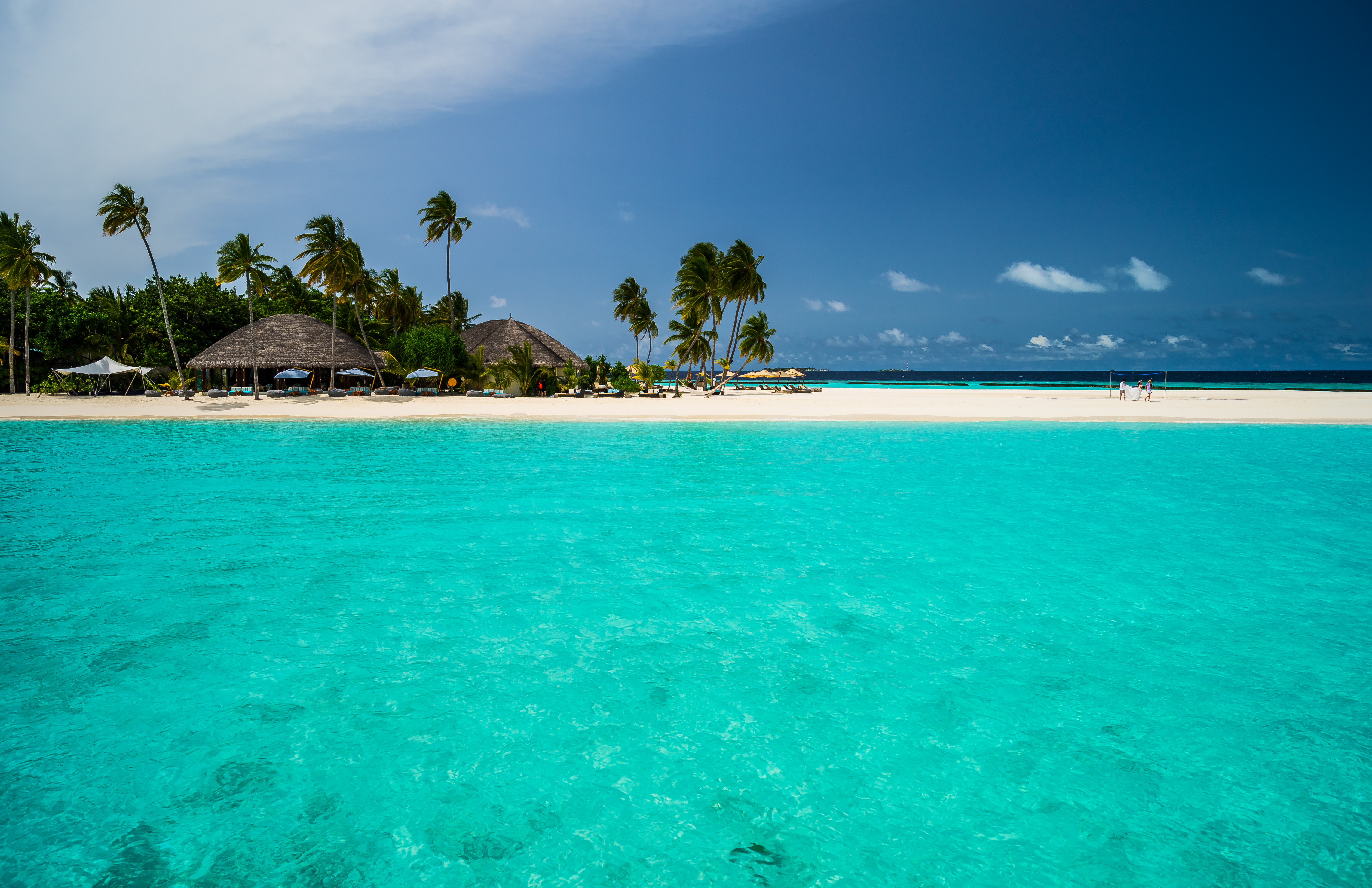 Description: A beach with a hut and palm trees on the shore of the ocean and a blue sky with clouds.