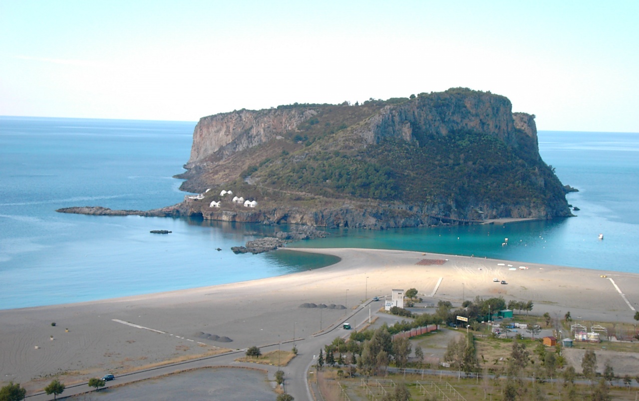 Description: A beach with a small island in the middle of it and a few boats in the water near it.