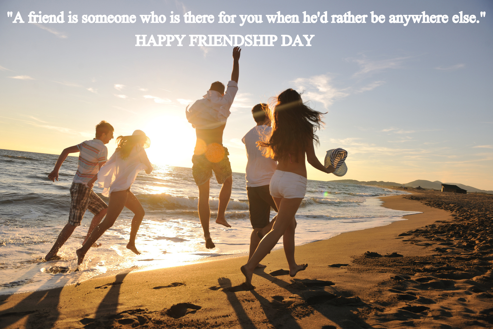 Description: A group of people jumping on a beach at sunset with a quote from a friend that says.