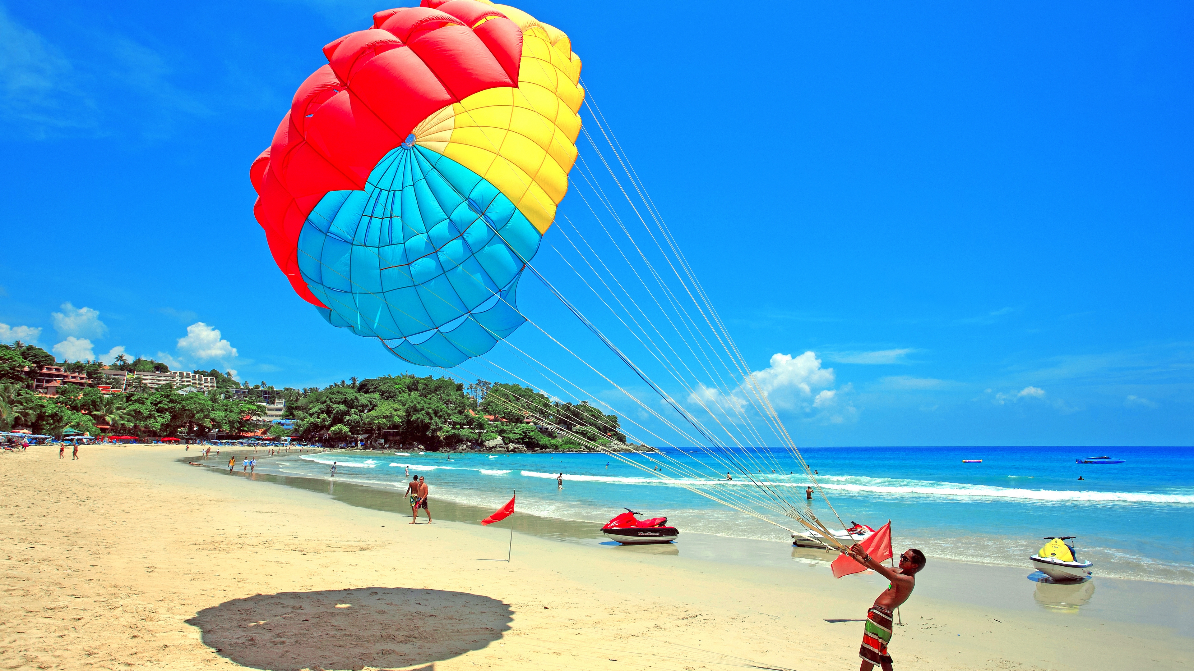 Description: A person on a beach flying a kite with a sky background and people in boats in the water behind them.