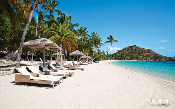 Description: A beach with lounge chairs and umbrellas on it and a mountain in the background with palm trees and blue water.