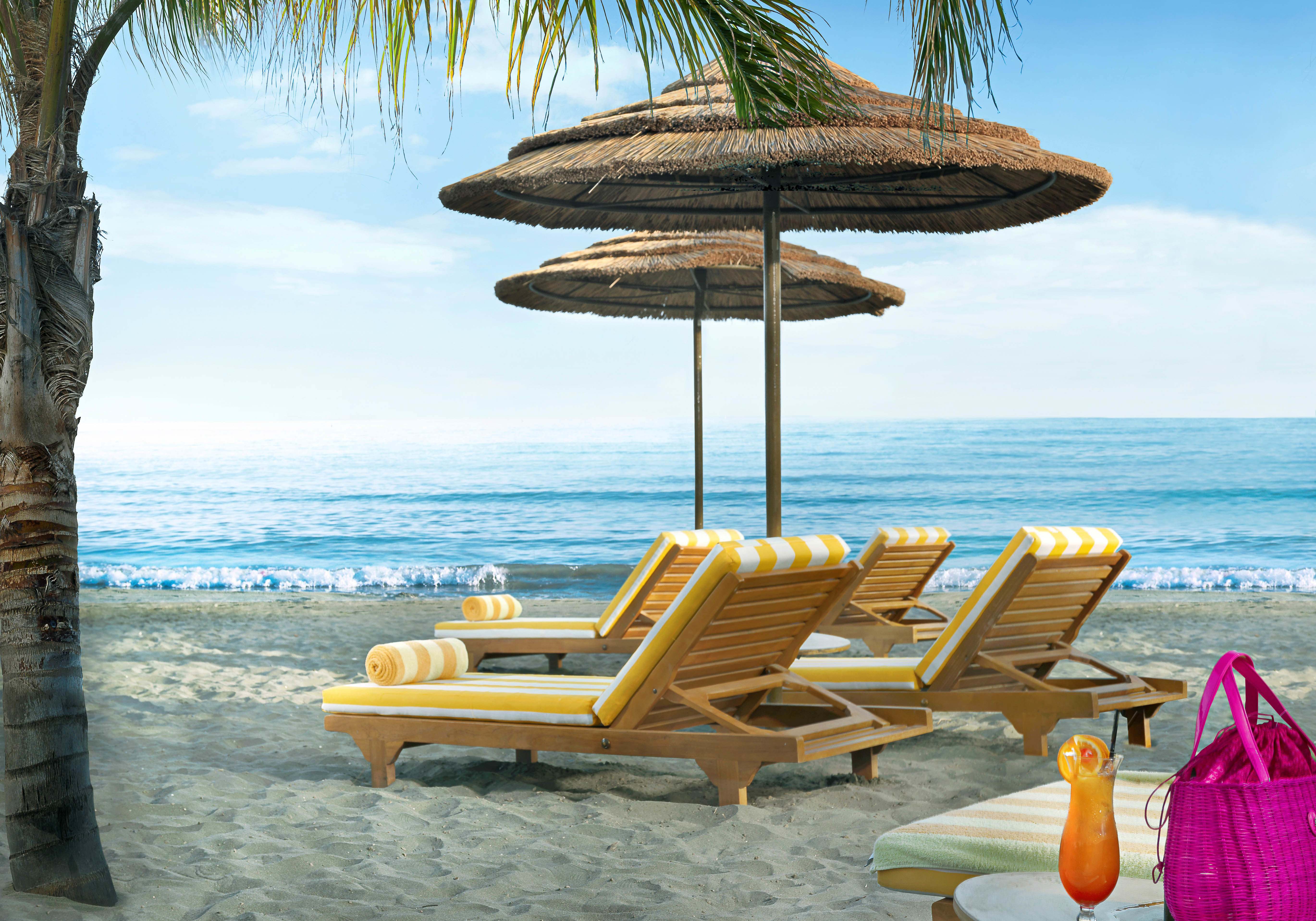 Description: A beach with lounge chairs and umbrellas on the sand and a beach bag and a pink bag on the beach.