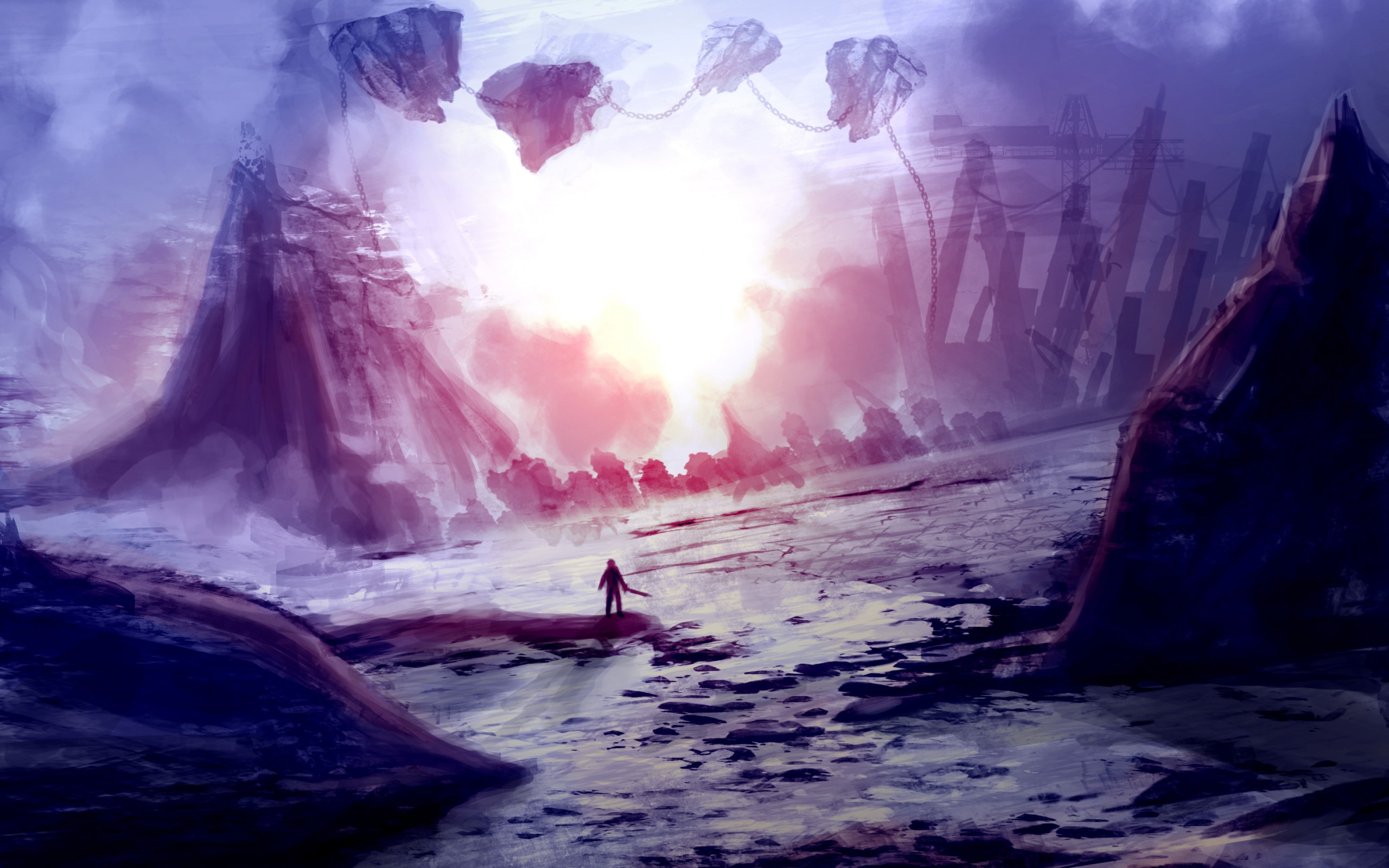 Description: A man standing on a beach next to a giant rock formation with a giant sun in the background and a giant rock formation in the foreground.