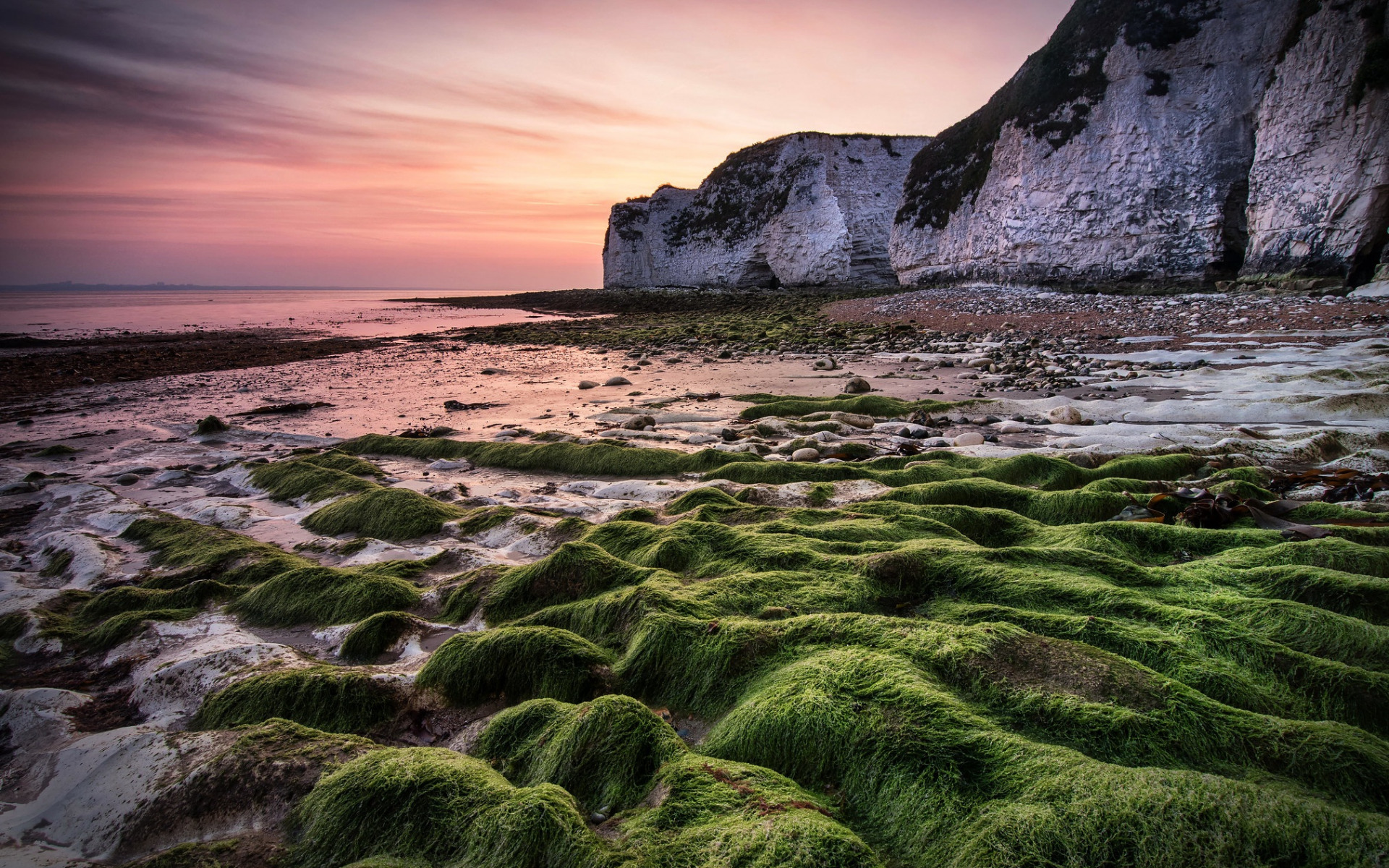 Description: A beach covered in green moss next to a cliff and ocean with a sunset in the background and a rock formation.