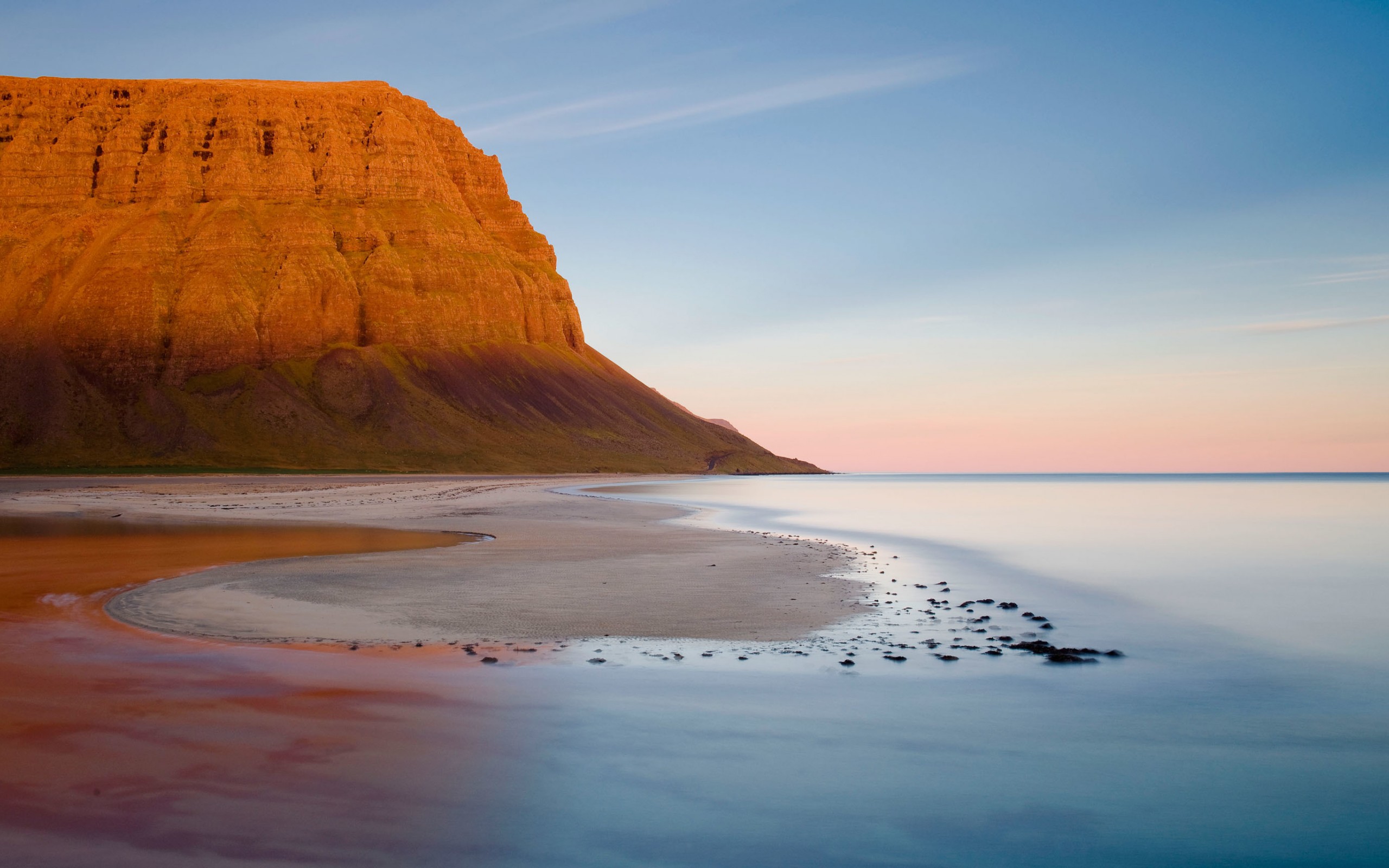 Description: A beach with a mountain in the background and a body of water in the foreground with a rock outcropping.