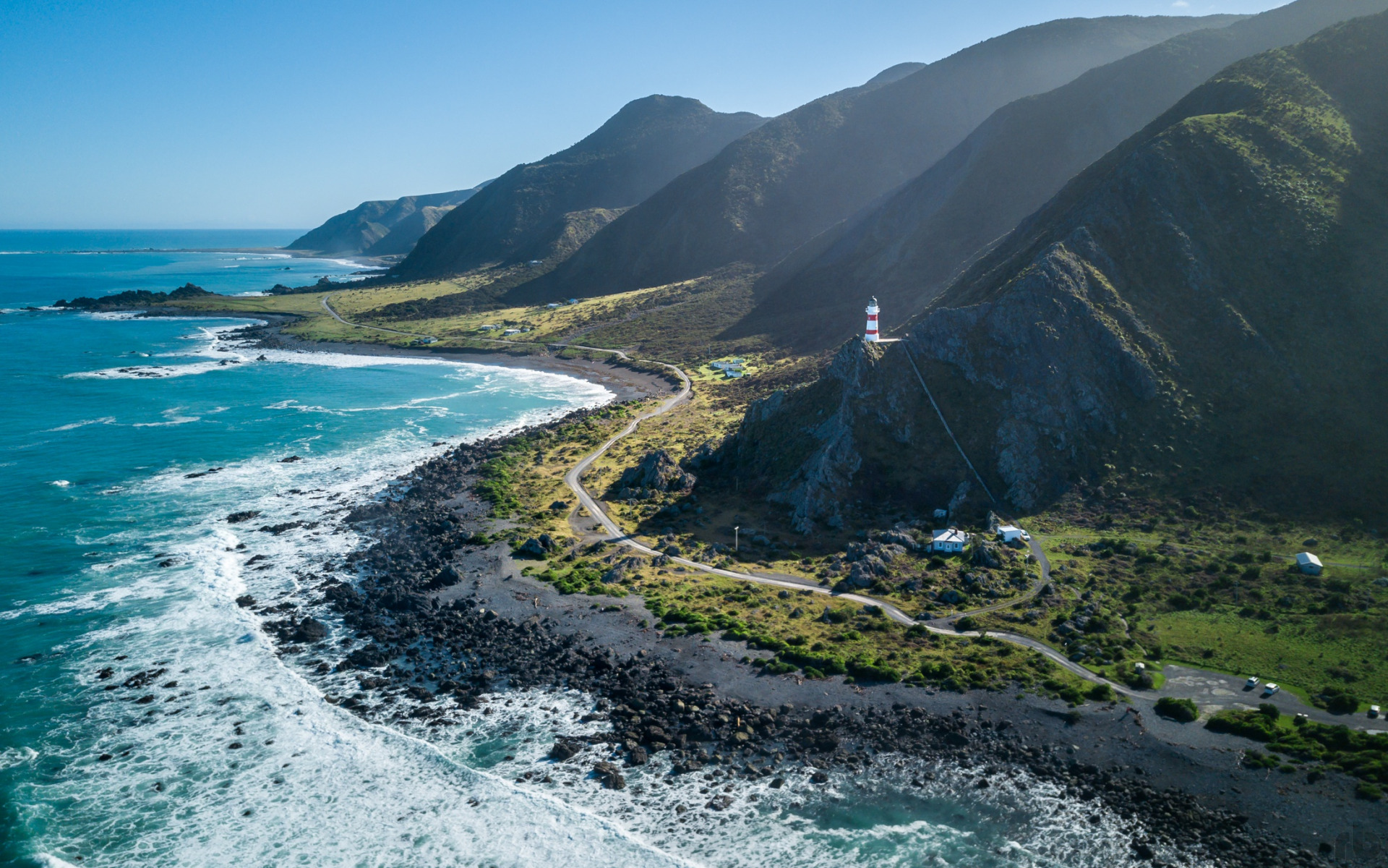 Description: A scenic view of a beach and mountains with a road going through it and a lighthouse on the top of the hill.