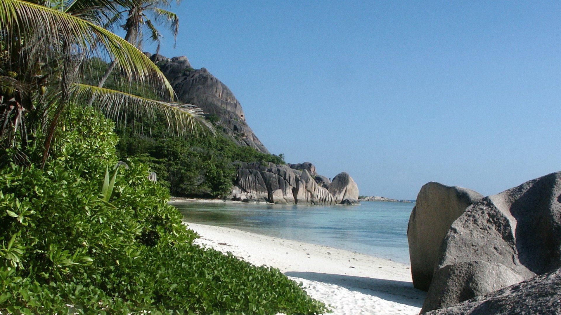 Description: A beach with a palm tree and a rock formation in the water and a beach with a white sand beach.