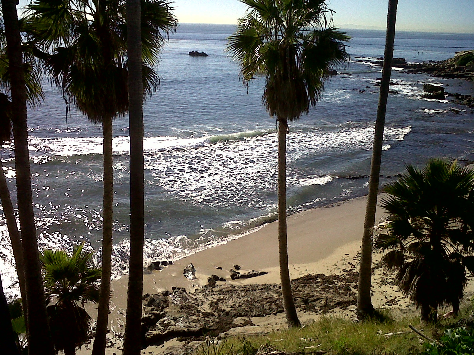 Description: A beach with palm trees and a boat in the water and a few people on the beach in the water.