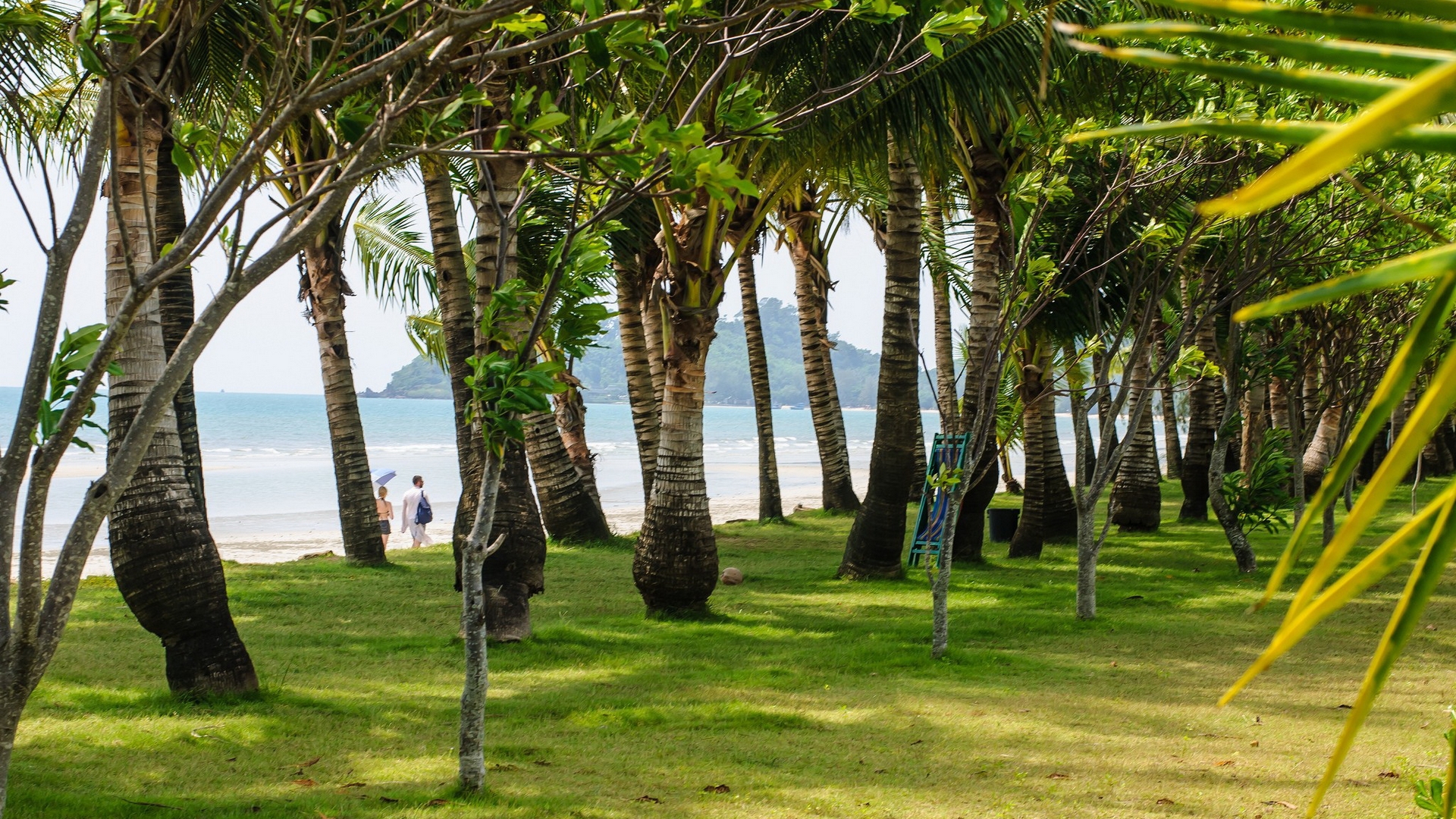 Description: A beach with palm trees and a couple walking on the beach in the distance with a blue sky and white water.