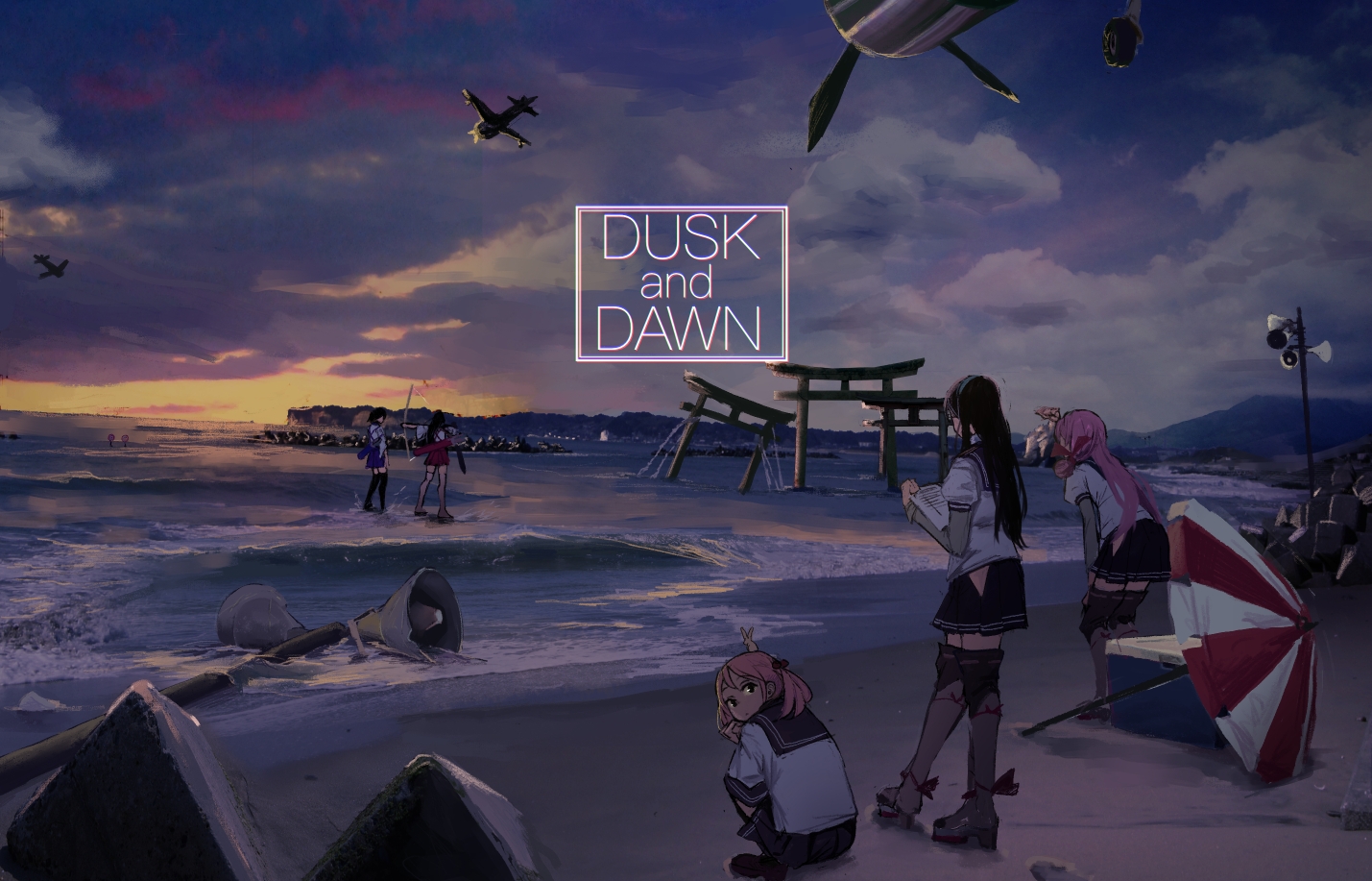 Description: A group of people standing on top of a beach next to the ocean under a cloudy sky with a plane flying overhead.