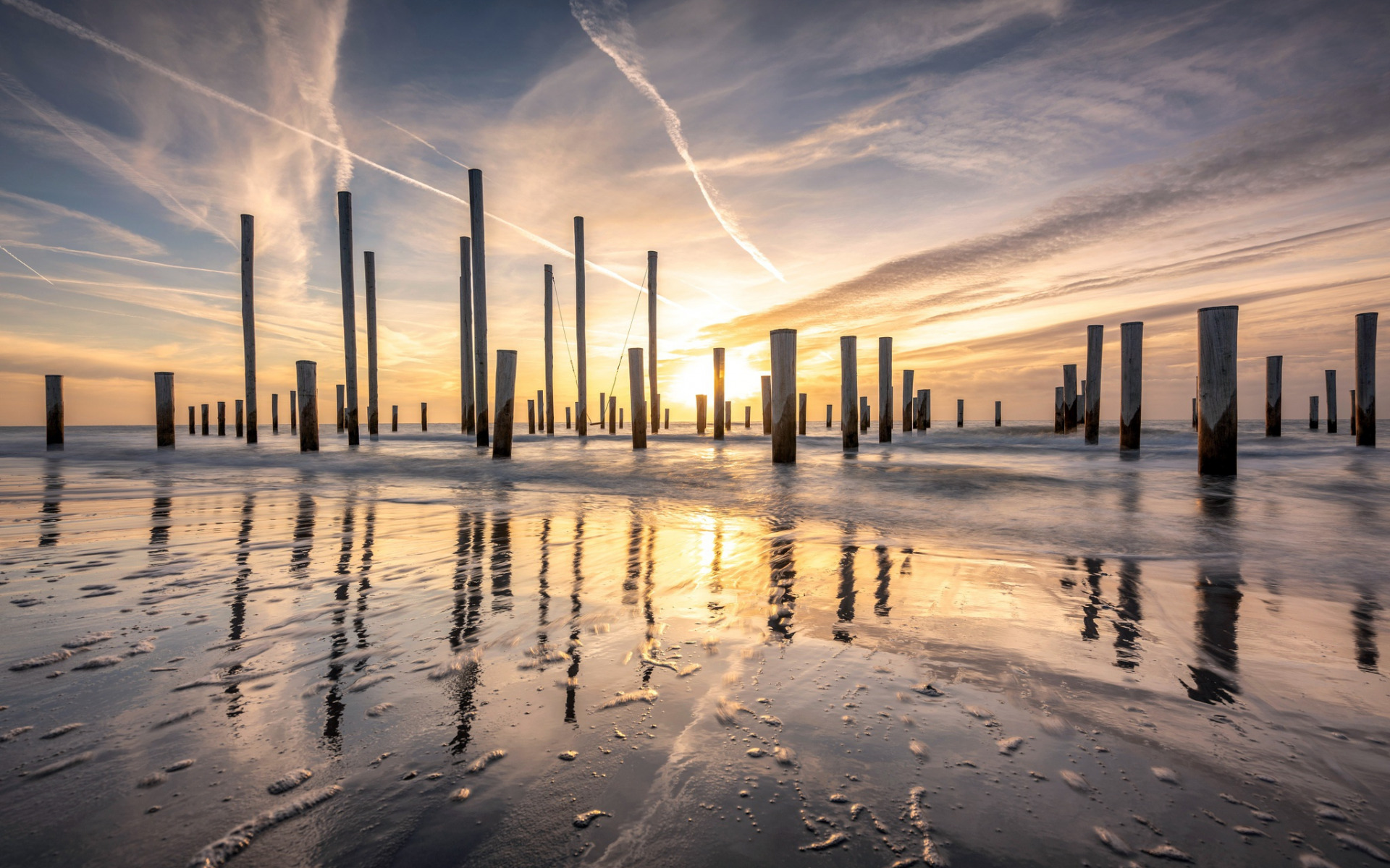 Description: A beach with a lot of poles sticking out of the water at sunset or sunrise time with the sun setting.