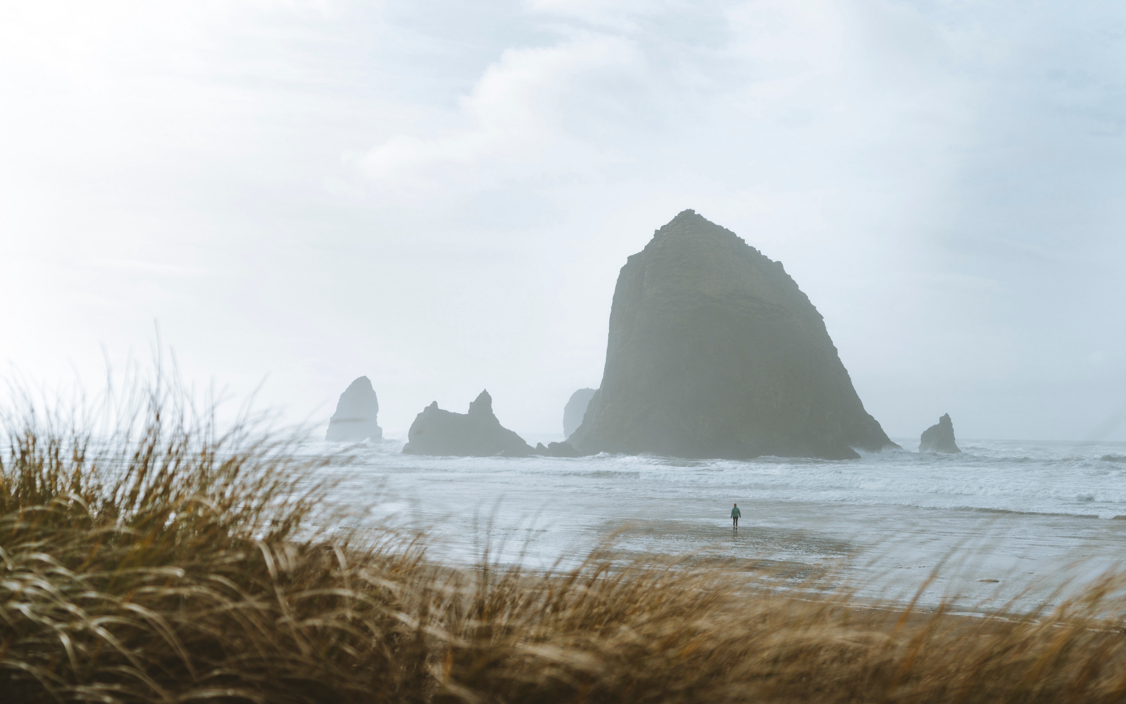 Description: A person standing on a beach near the ocean with a rock formation in the background and a person walking on the beach.
