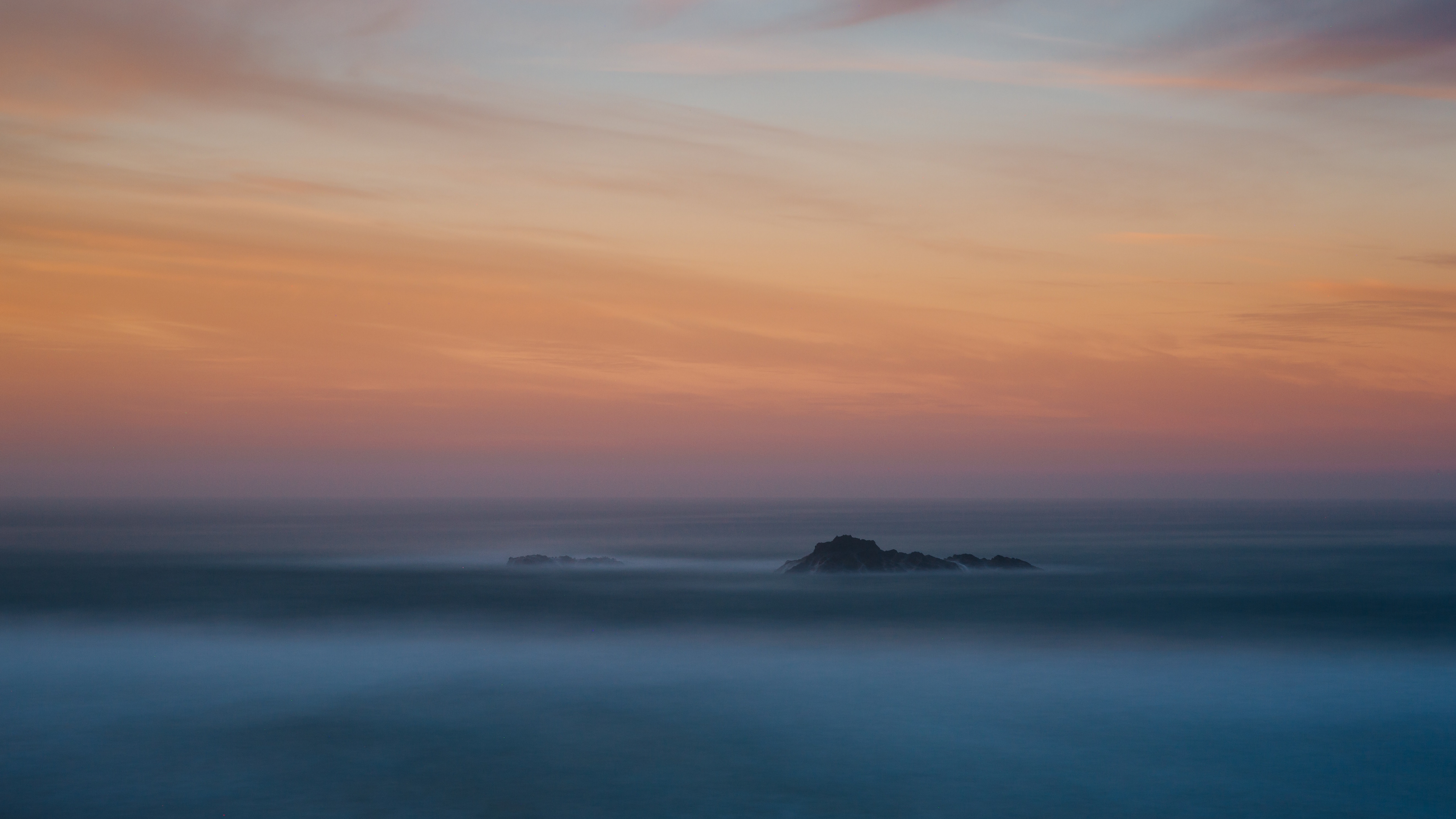 Description: A view of a beach with a rock in the distance and a sunset in the background with clouds in the sky.