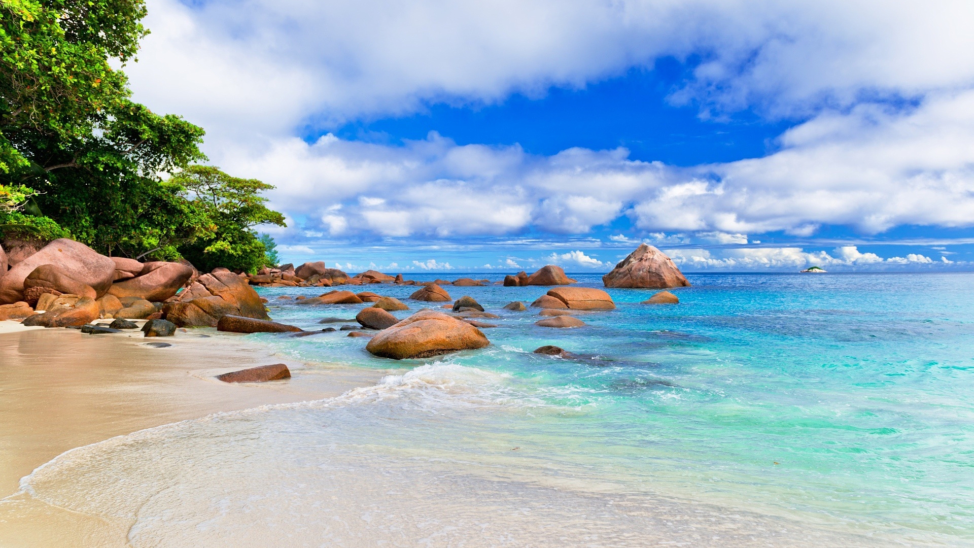 Description: A beach with rocks and clear blue water under a cloudy sky with clouds in the sky and a few waves.