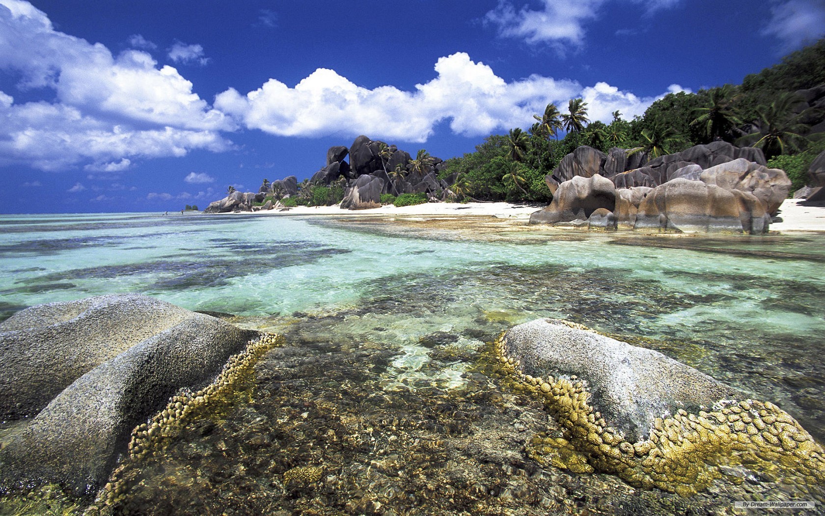 Description: A beach with rocks and corals in the water and a blue sky with clouds above it and a few trees.