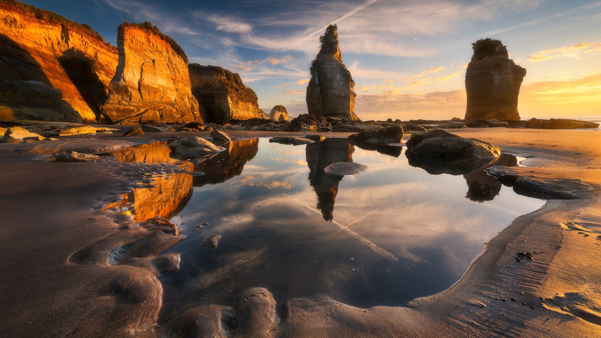 Description: A beach with a body of water and rocks on the shore and a sky with clouds reflected in the water.