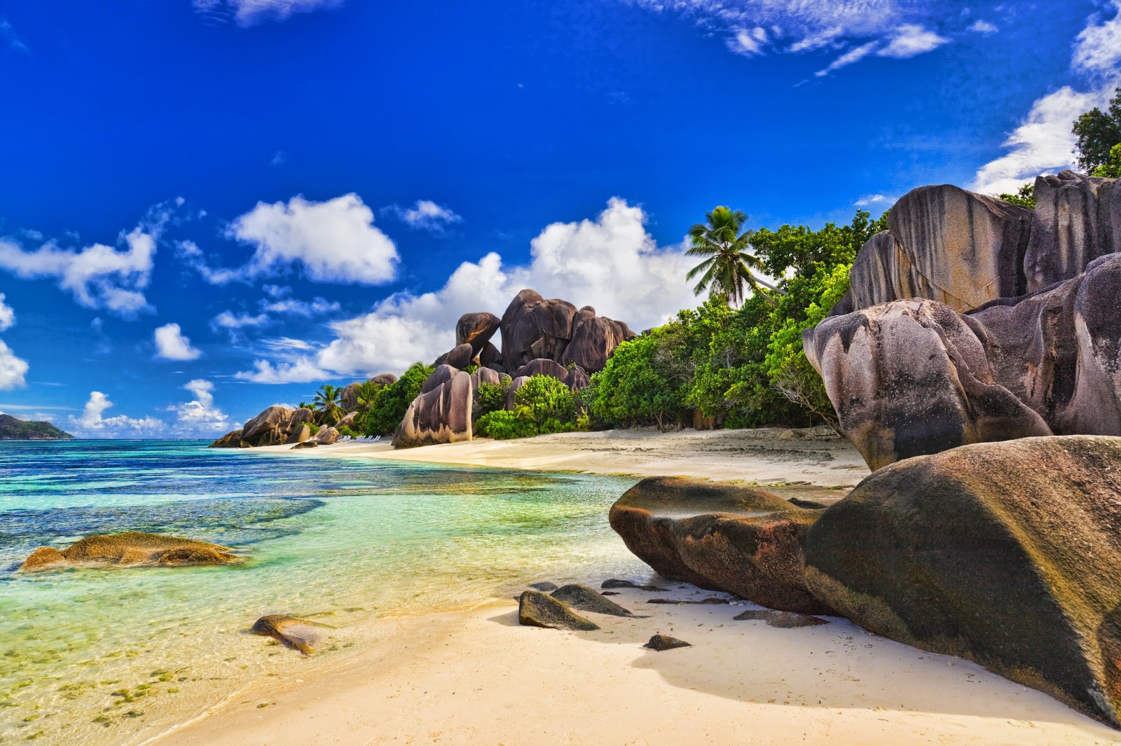 Description: A beach with rocks and water and a blue sky with clouds above it and a few palm trees on the other side.