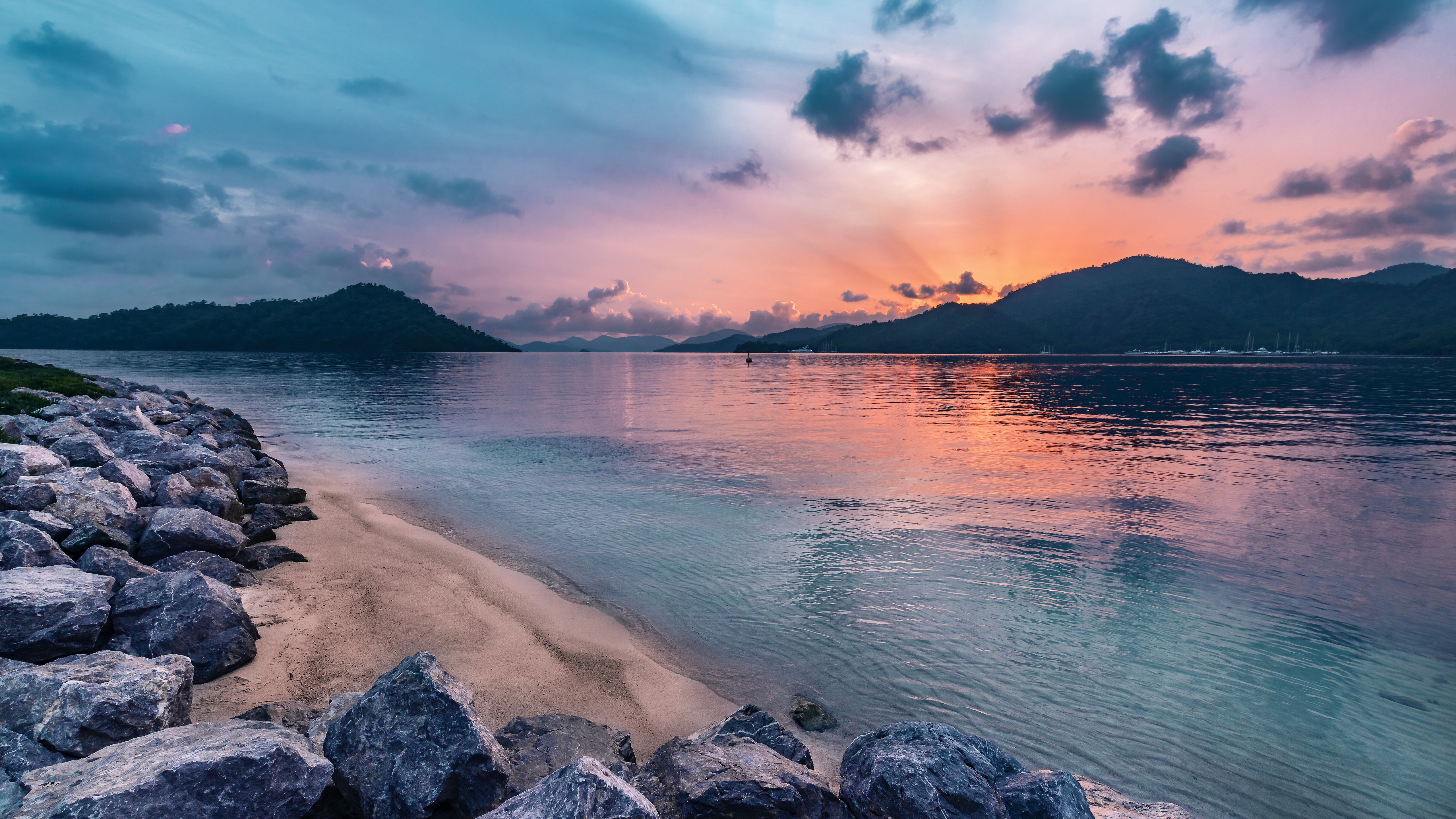 Description: A beach with rocks and water under a cloudy sky at sunset with a boat in the distance and mountains in the distance.