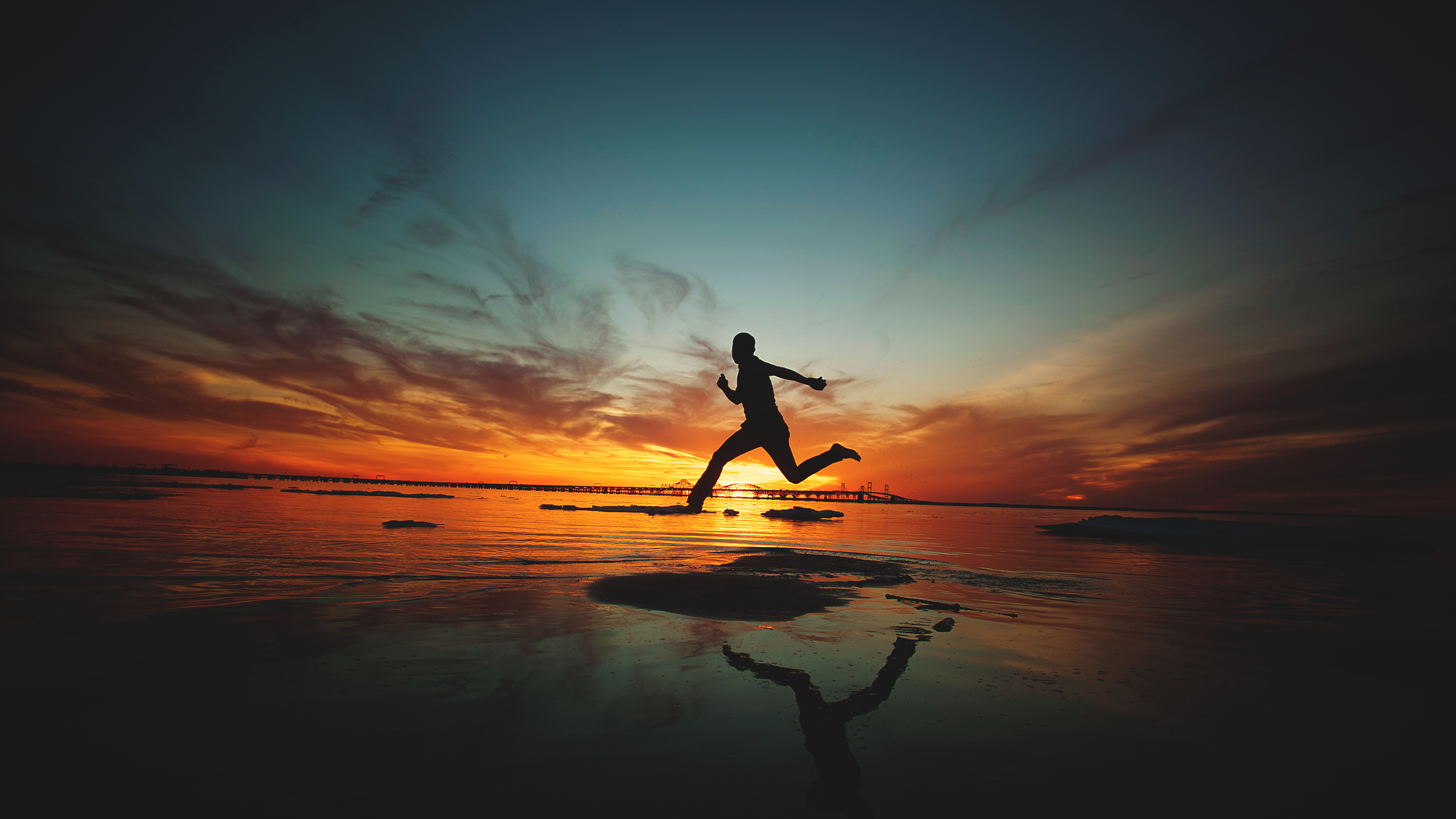 Description: A person running on the beach at sunset with a sky background and a reflection of the sun in the water.