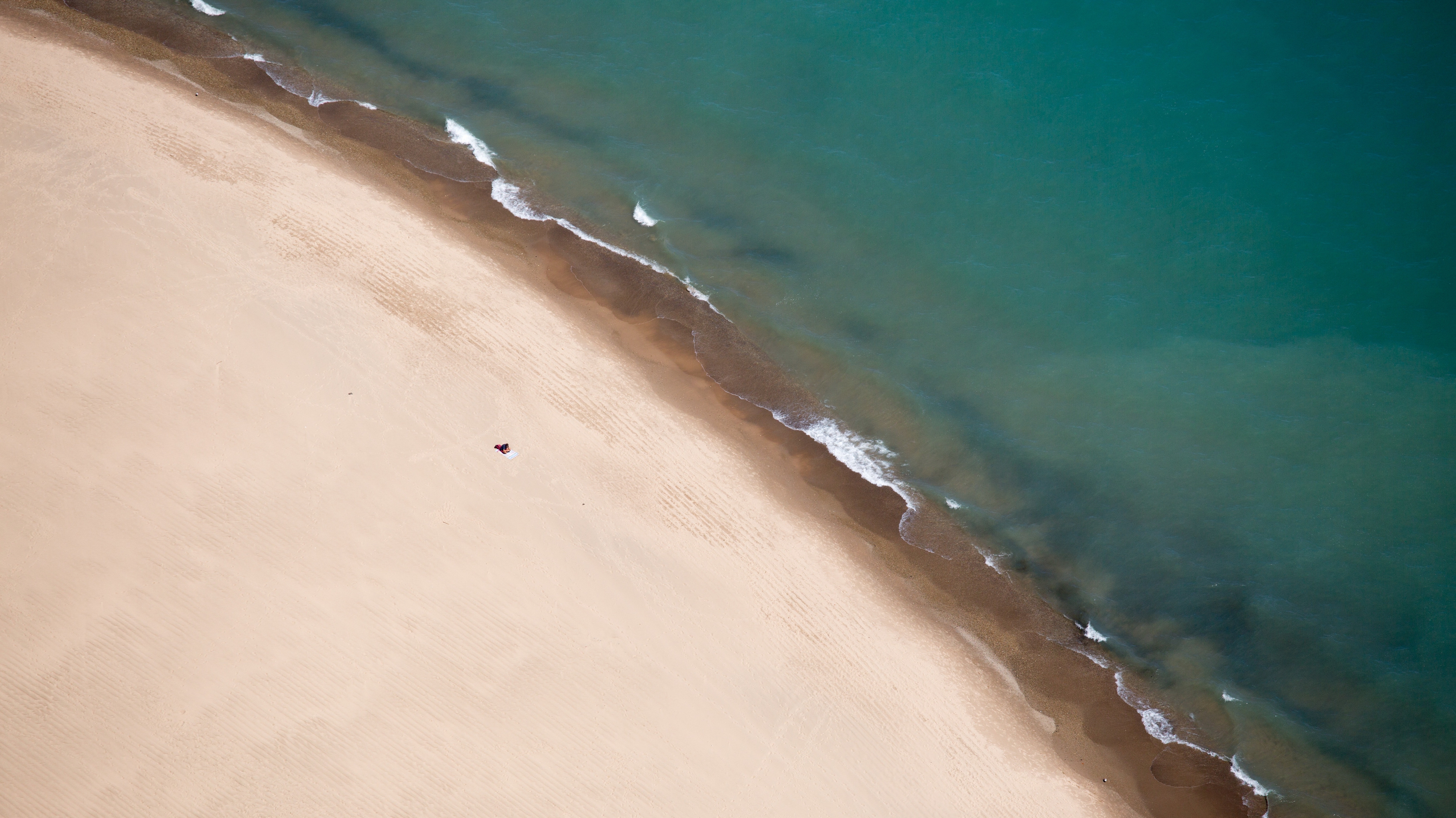 Description: A beach with a sandy shore and a body of water with a lone person walking on it and a bird's eye view of the beach.