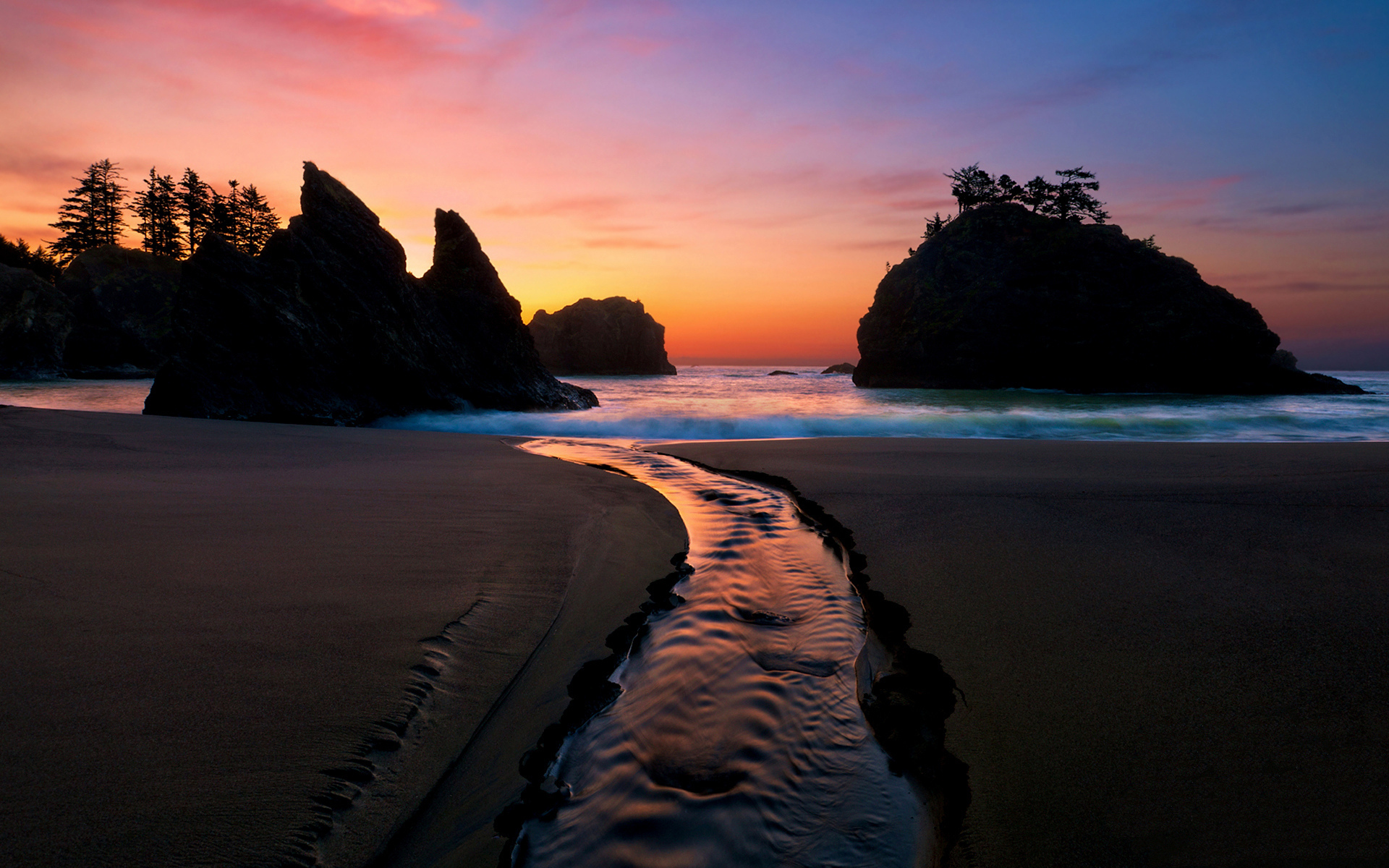 Description: A beach with a stream of water running through it and a sunset in the background with rocks in the foreground.