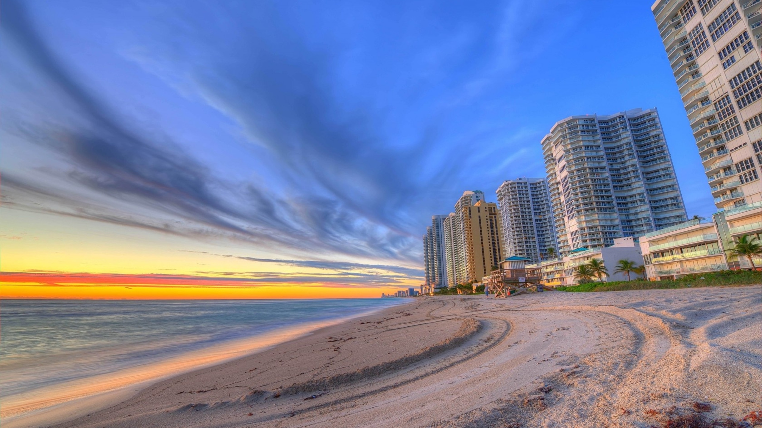 Description: A beach with a few buildings in the background and a sunset in the foreground with clouds in the sky.