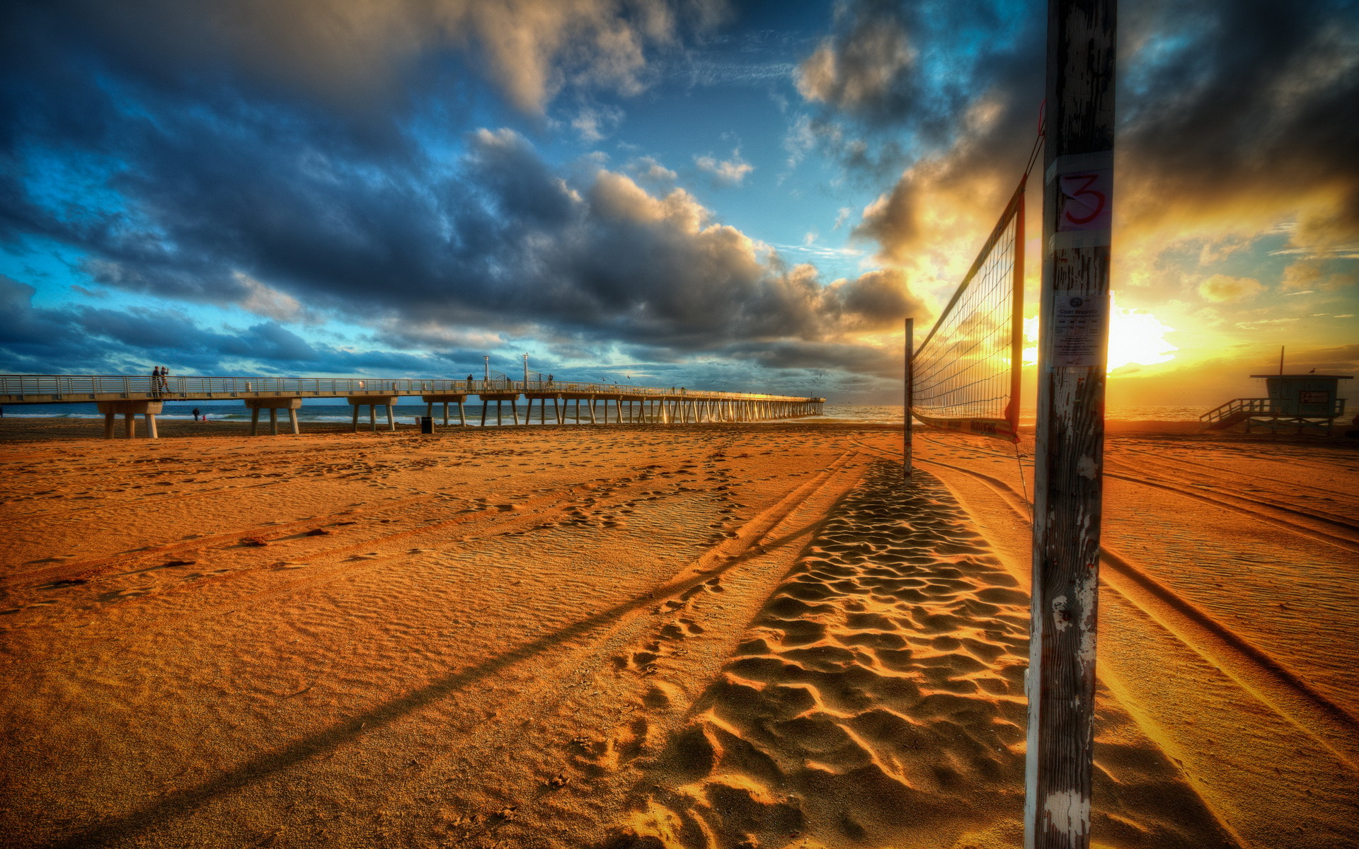 Description: A beach with a volleyball net and a sunset in the background with clouds in the sky and a beach volleyball net in the foreground.