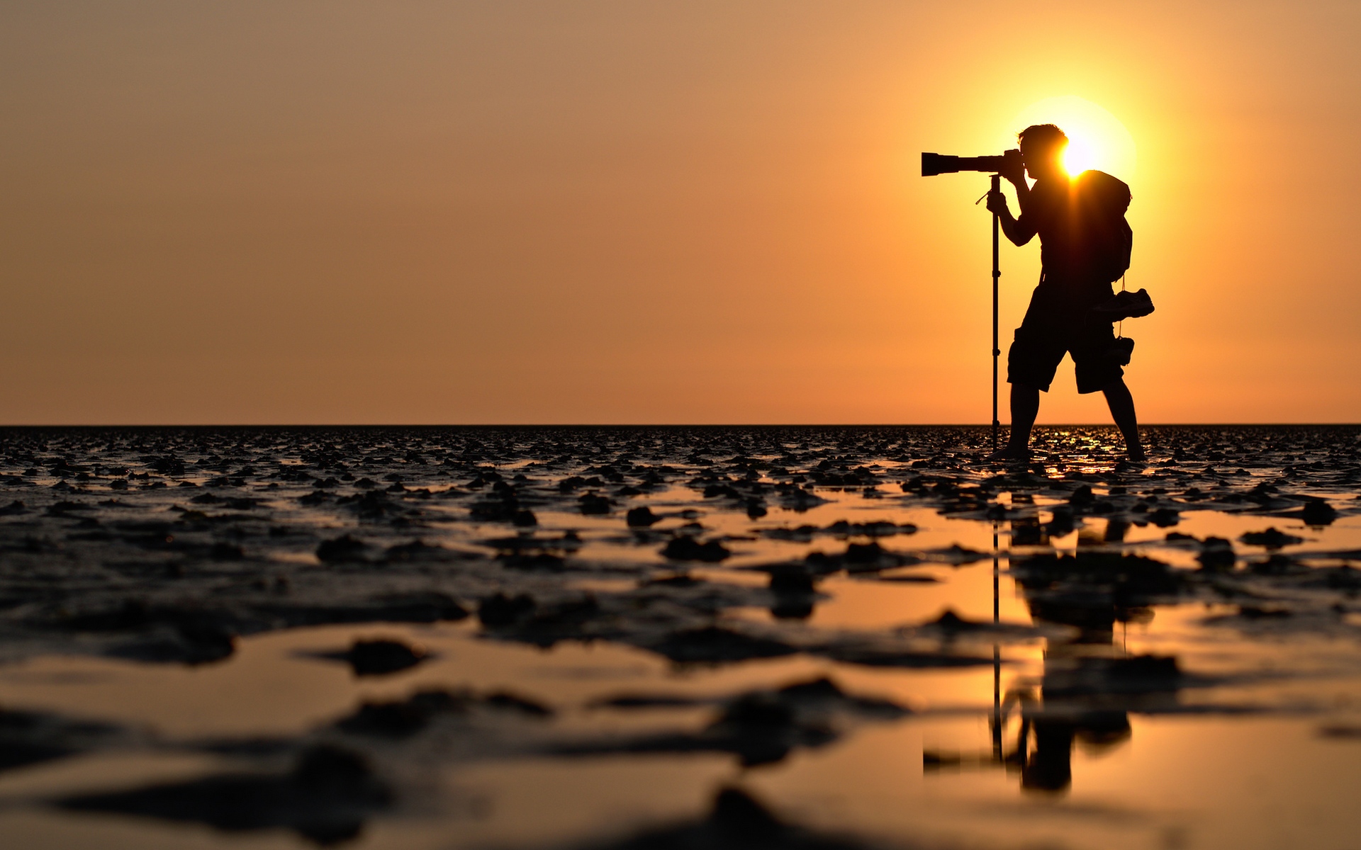 Description: A man standing on a beach with a camera in his hand and a sunset in the background behind him.
