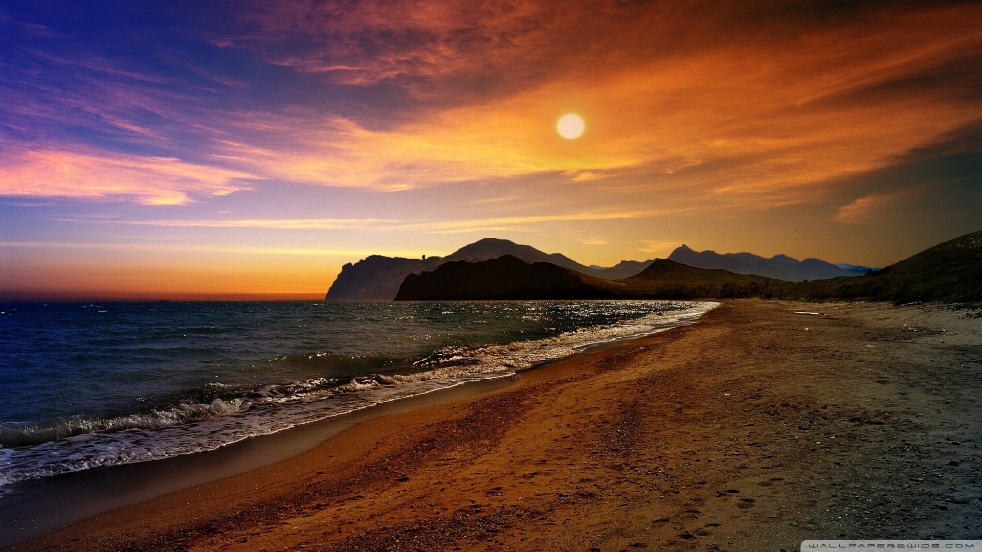Description: A beach with a sunset and mountains in the background and a body of water with waves coming in to shore.