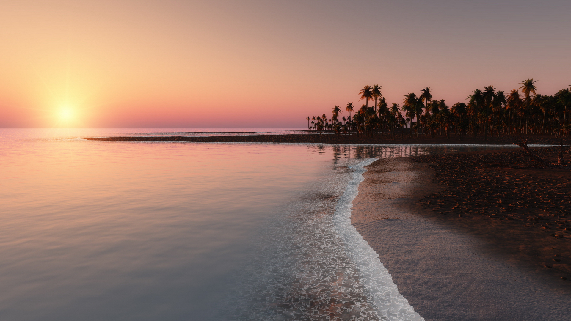 Description: A beach with a sunset and palm trees in the background and a body of water with waves coming in.