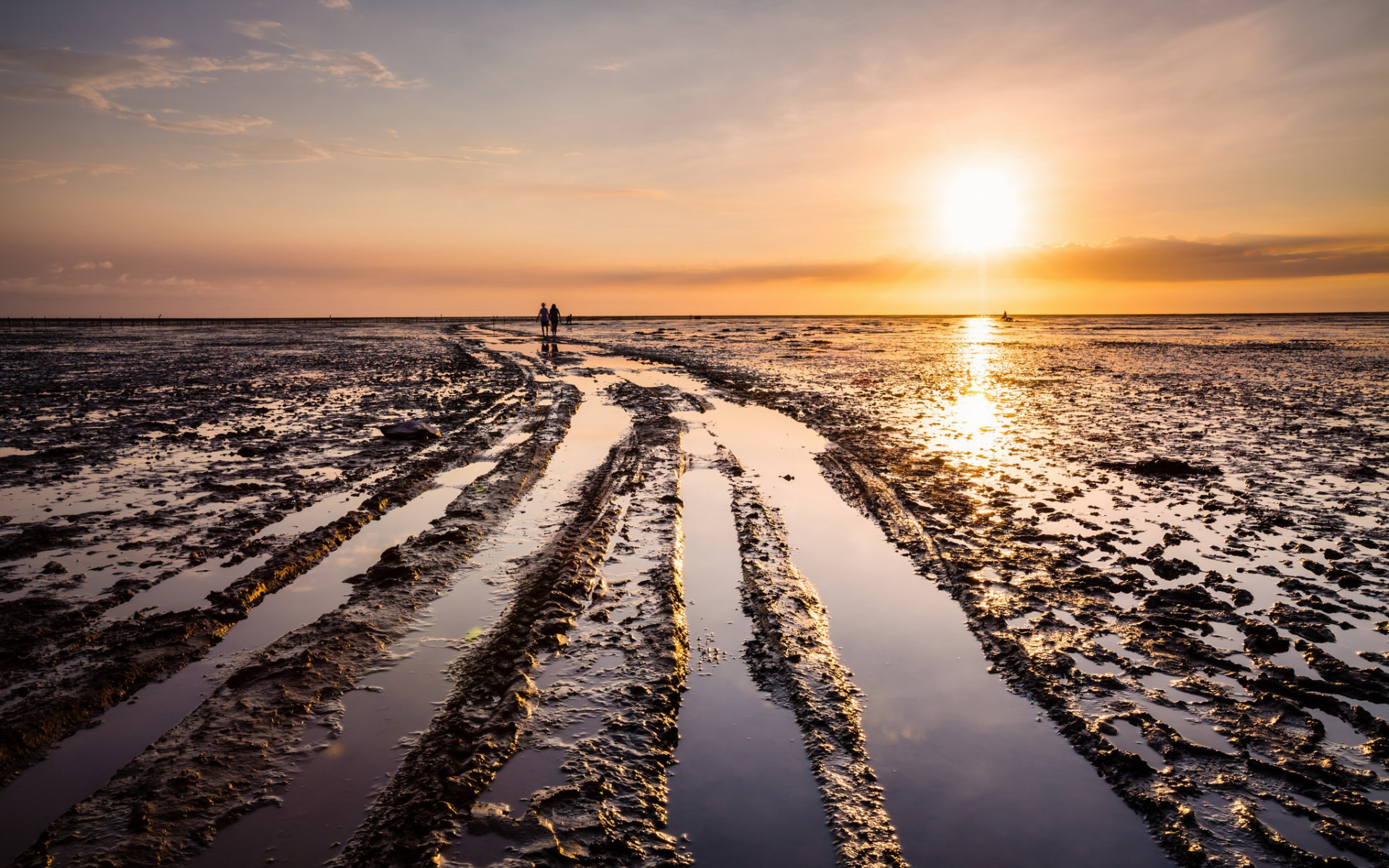 Description: A person walking on a beach at sunset with the sun in the distance and the tide out on the beach.