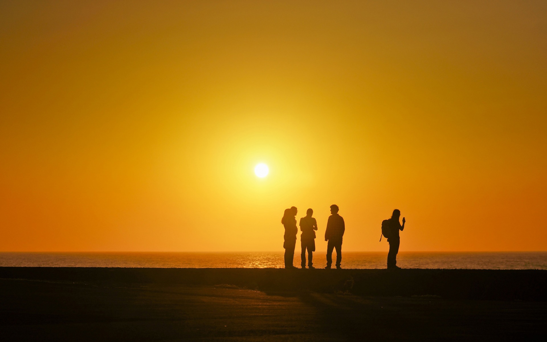 Description: A group of people standing on top of a beach at sunset time with the sun setting in the background.