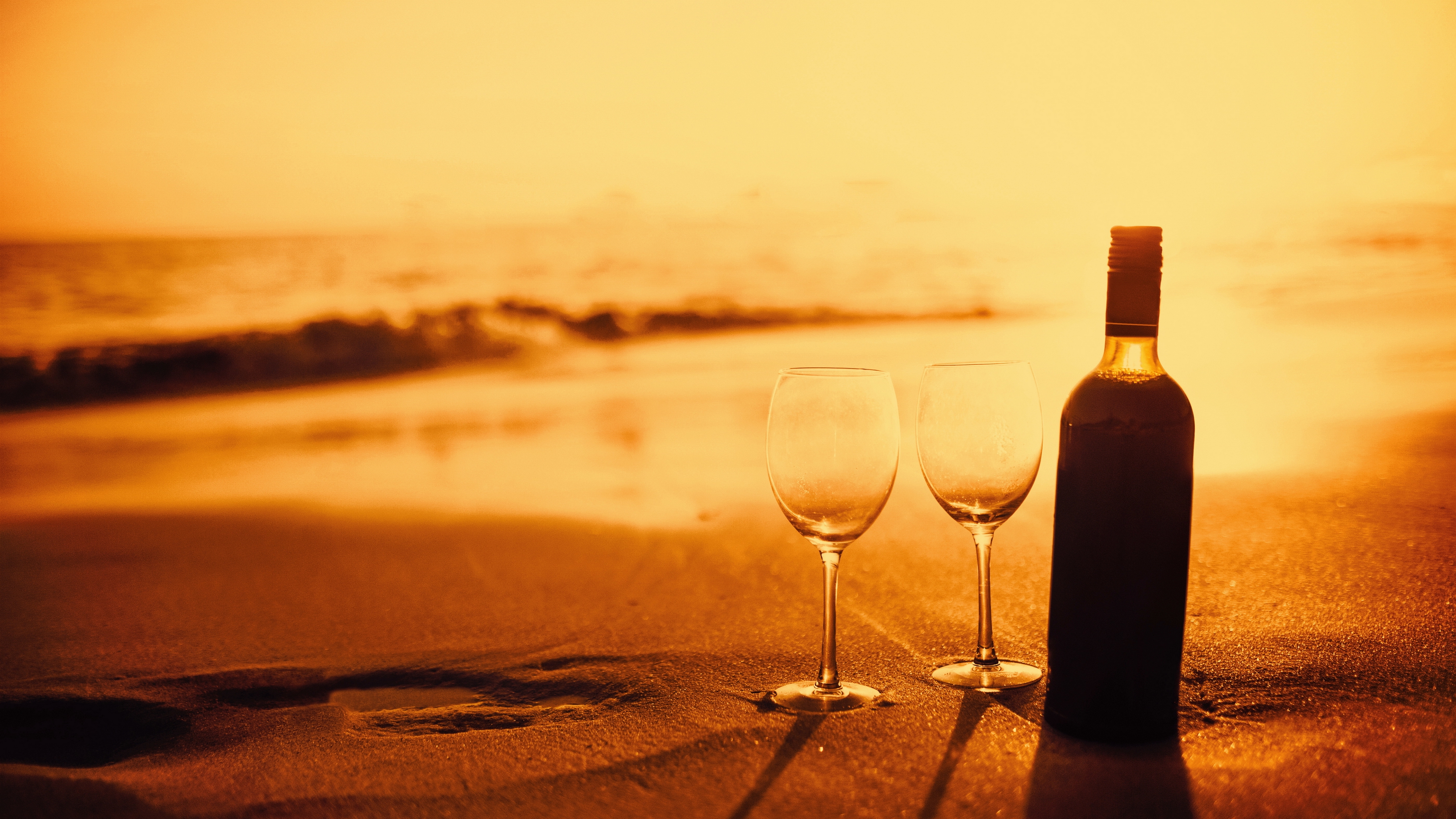Description: Two wine glasses and a bottle of wine on a beach with the sun setting in the background and a bottle of wine in the foreground.