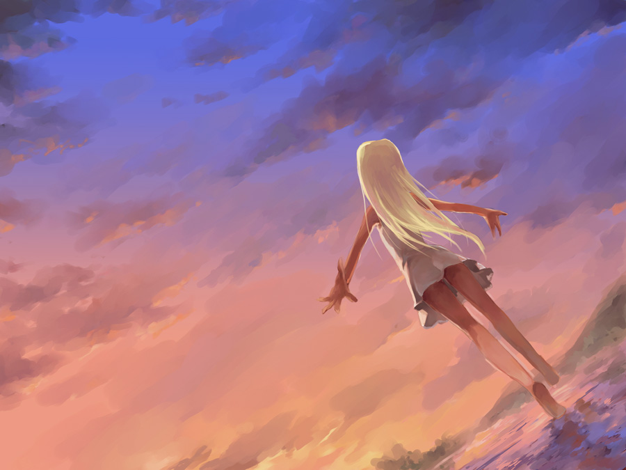 Description: A painting of a woman walking on a beach at sunset with a sky background and clouds in the background.