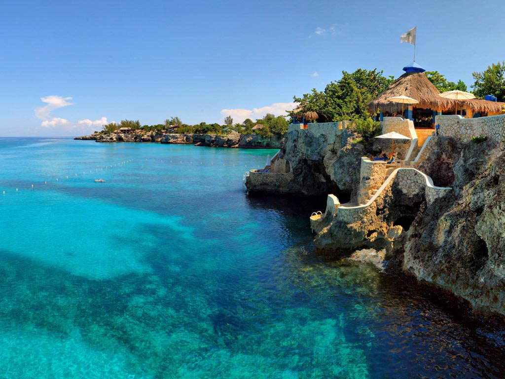 Description: A beach with a thatched roof and a blue lagoon with clear water and a beach umbrella on the roof.