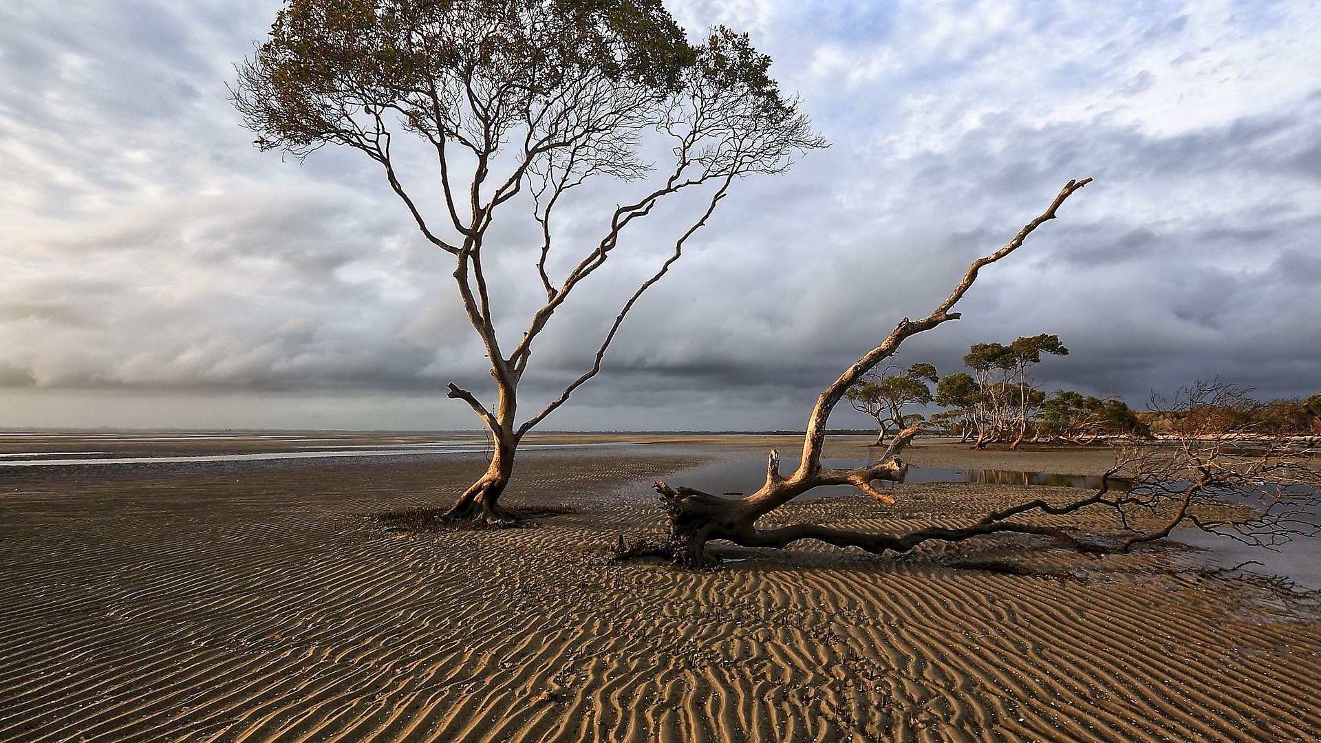 Description: A tree that is sitting in the sand near the water and clouds in the sky above it is a beach with a tree and a few sand tracks.