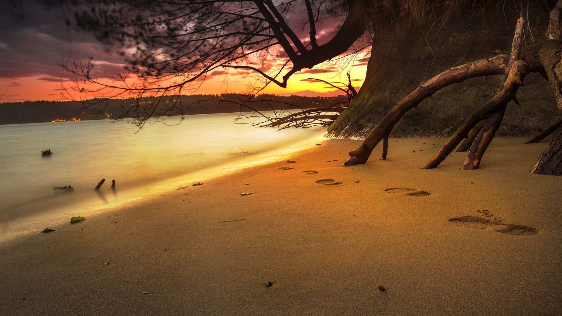 Description: A beach with a tree and a body of water at sunset with footprints in the sand and a few people walking on the beach.