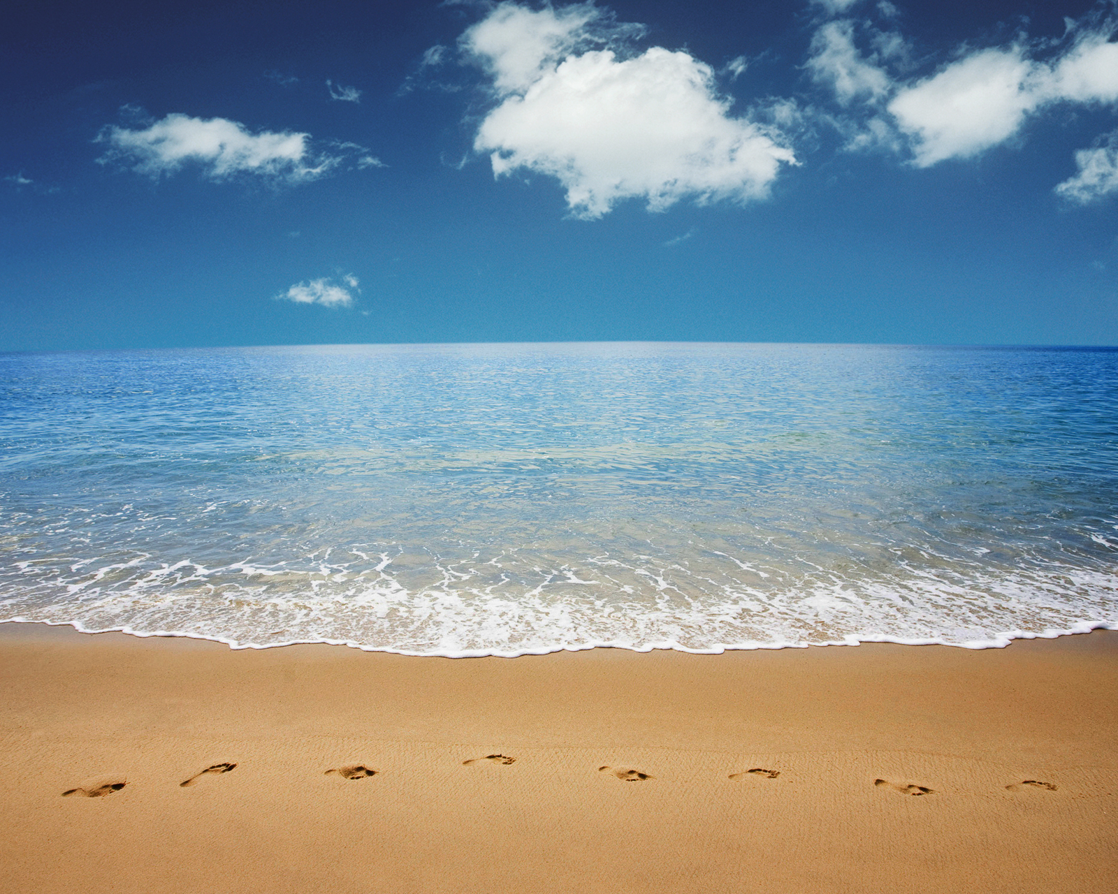 Description: A beach with a wave coming in and footprints in the sand and a blue sky with clouds above it.