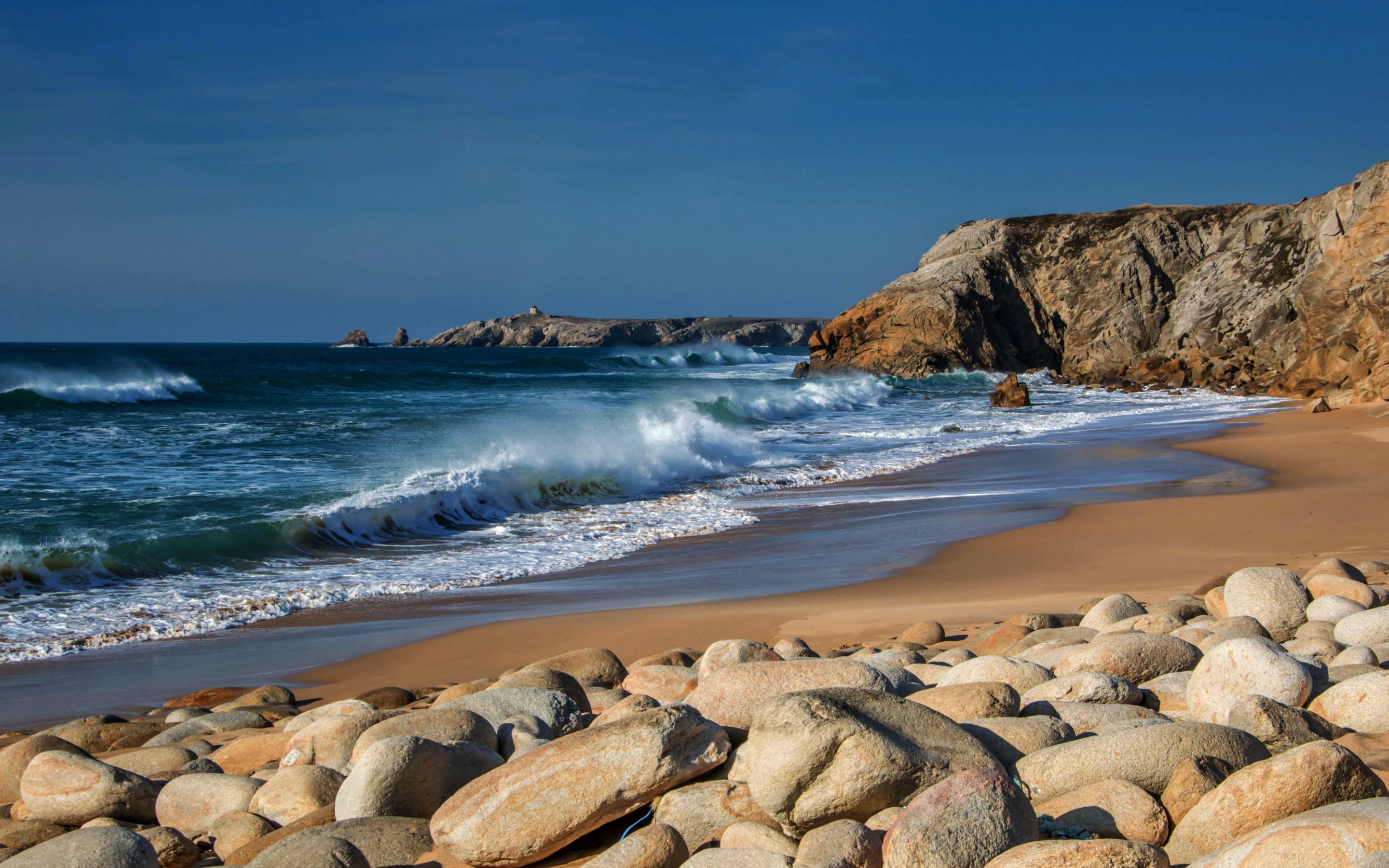 Description: A beach with a wave coming in to shore and a person walking on the beach with a surfboard.