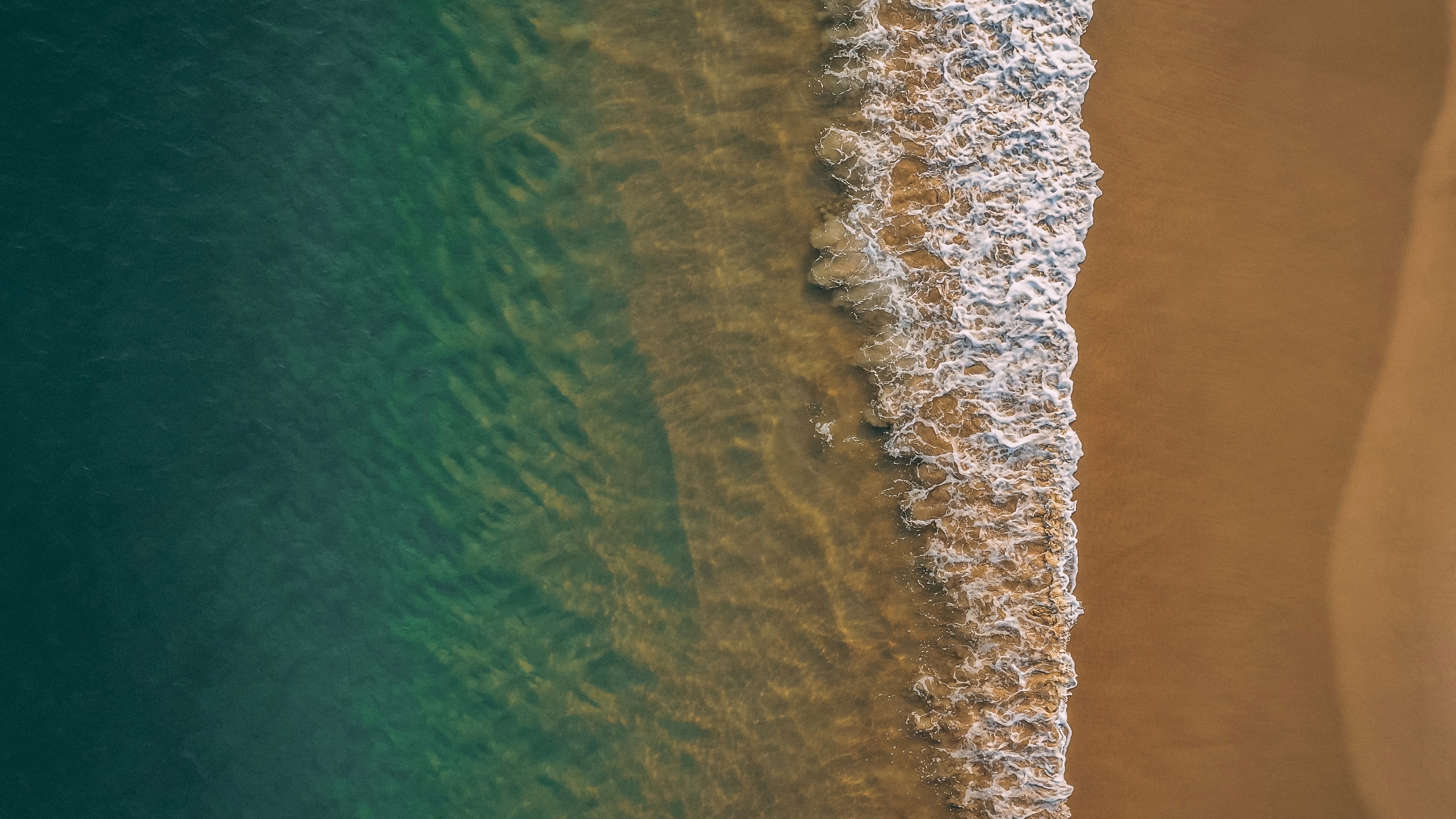 Description: A beach with a wave coming in to the shore and a person riding a surfboard on the beach.