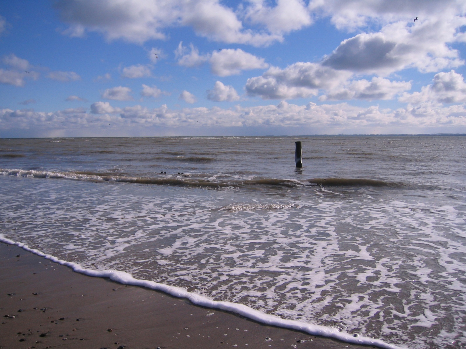 Description: A beach with waves crashing on the shore and a pole sticking out of the water's edge in the distance.