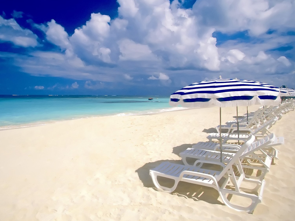 Description: A beach with a row of white lawn chairs and an umbrella on it with a blue sky and clouds in the background.