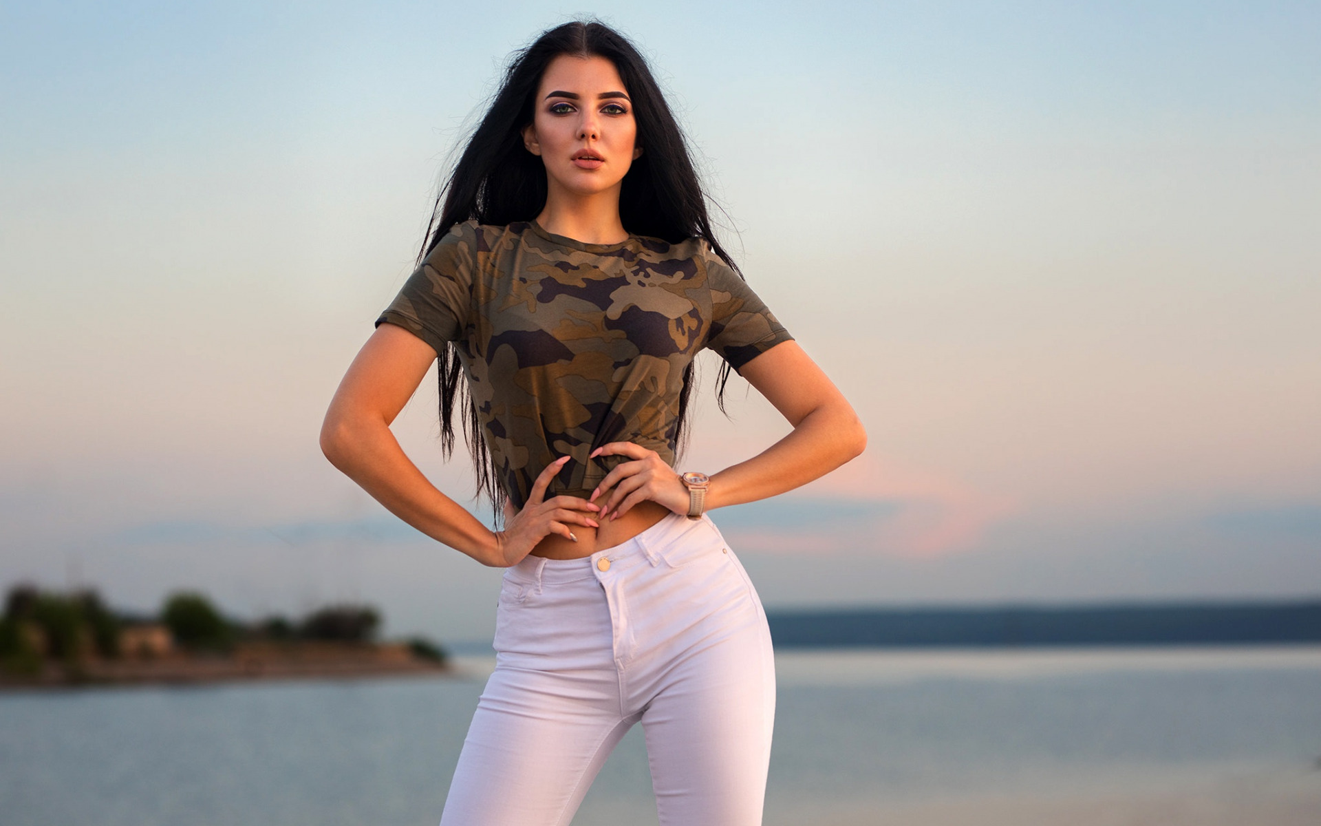 Description: A woman standing on a beach with her hands on her hips and her hands on her hips.