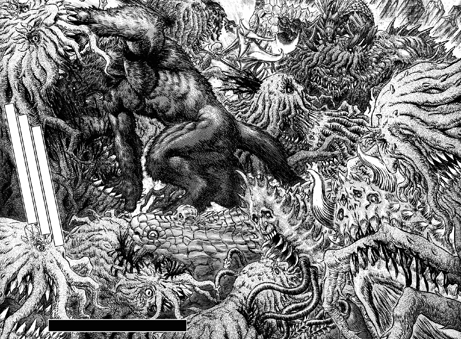 Description: A black and white drawing of a bear attacking a demon in the woods with other animals around it.