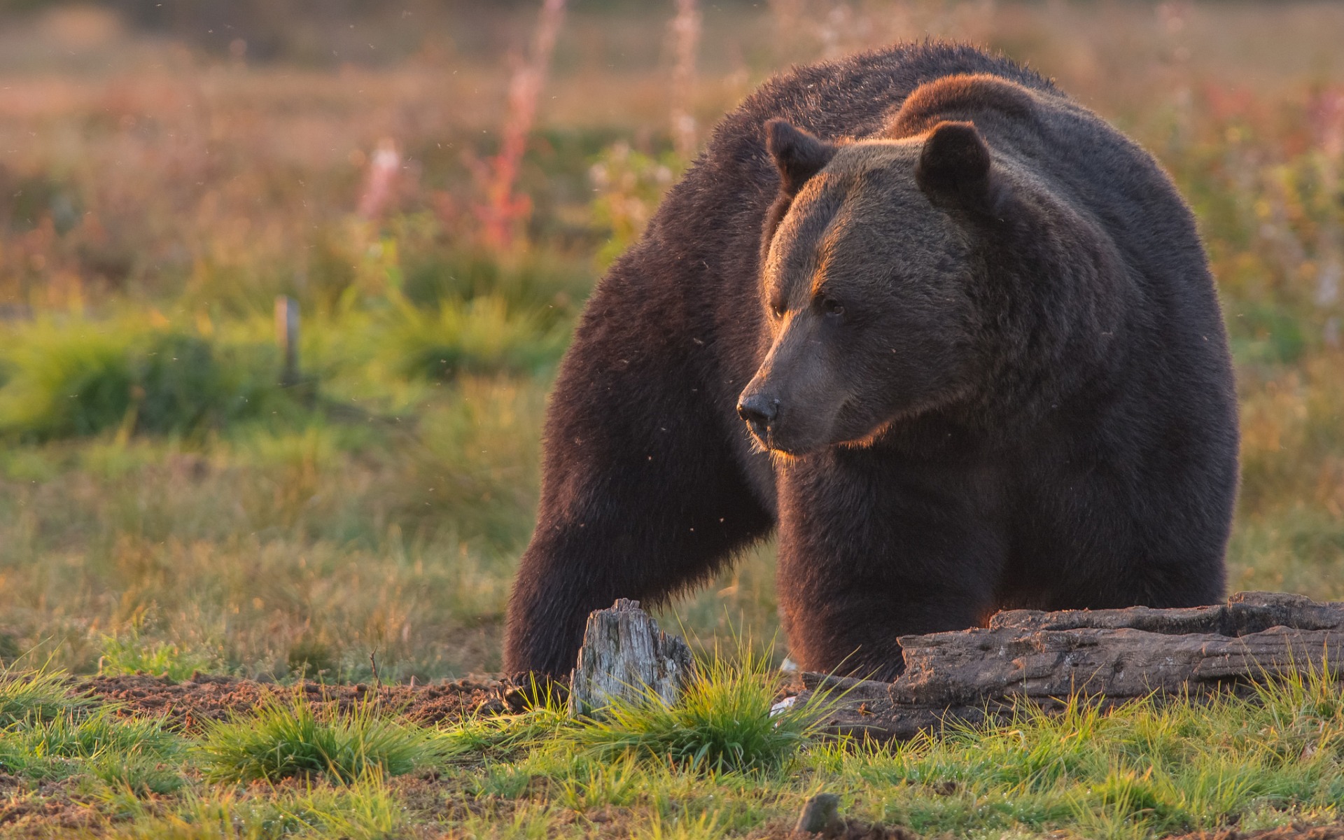 Description: A large brown bear walking across a grass covered field next to a log and tree stumps in the grass.