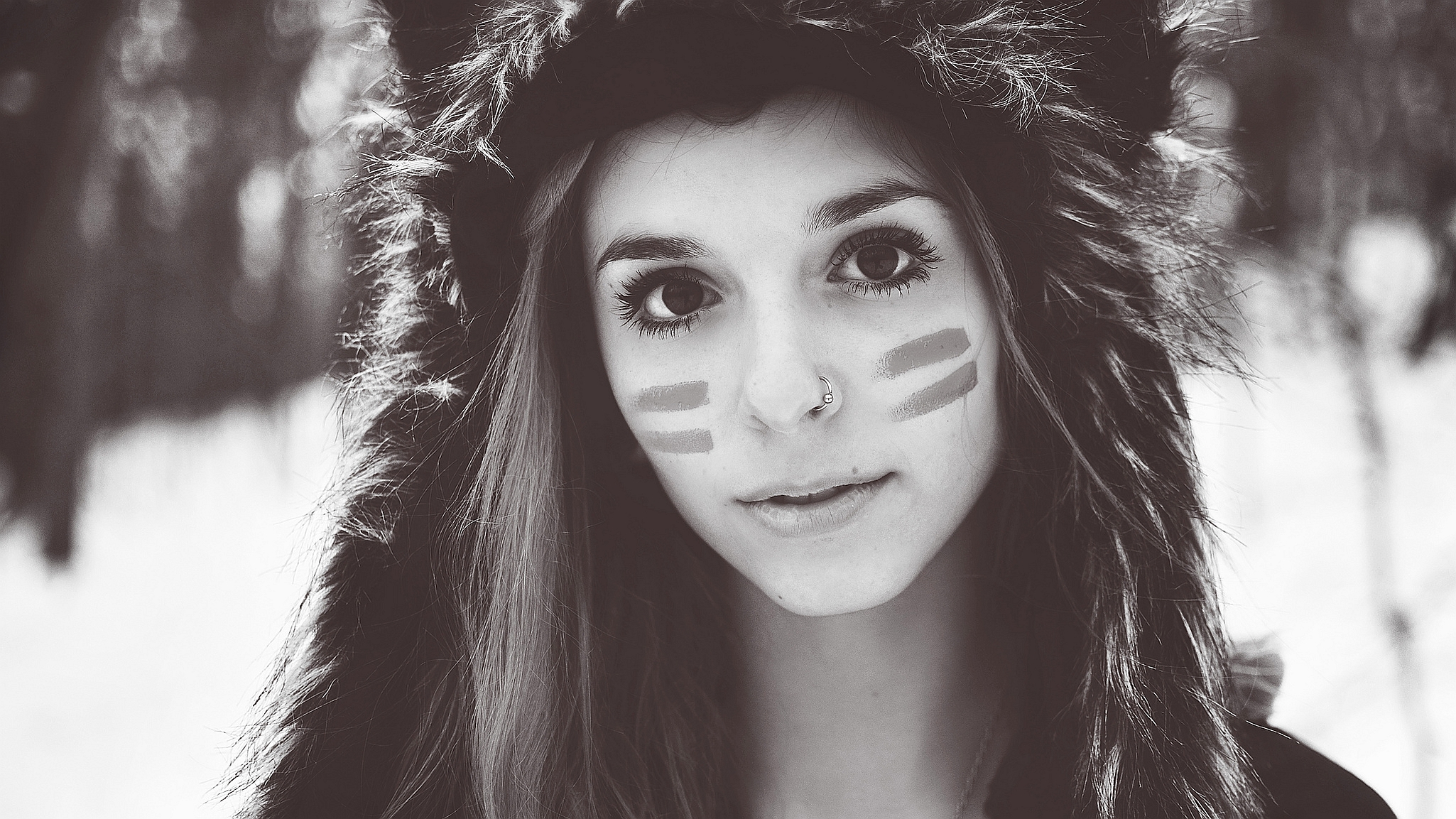 Description: A woman with a bear hat and a face painted on her face with a bear's tail on her head.