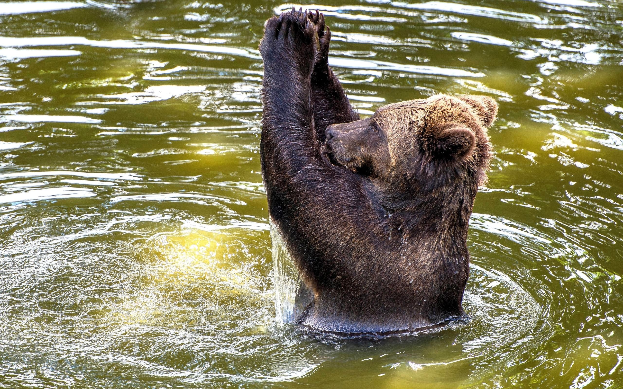 Description: A bear is standing in the water and reaching up to catch something in the air with his paws and paws.