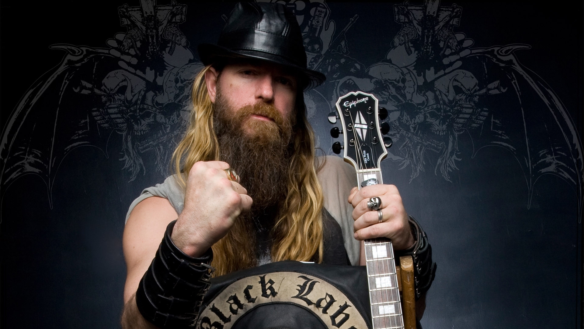 Description: A man with a beard and a leather hat holding a guitar in his hands and a black leather hat on his head.