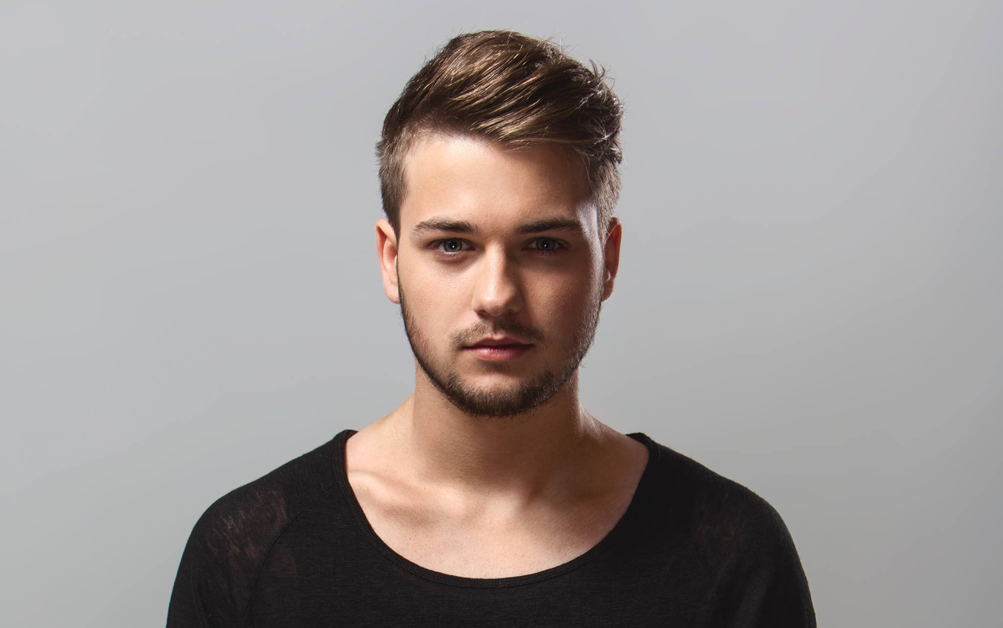 Description: A man with a beard and a black shirt on a gray background with a white background and a gray background.