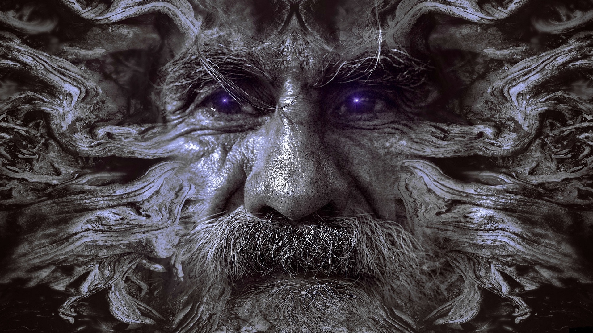 Description: A man with a beard and blue eyes with a strange look on his face and face.